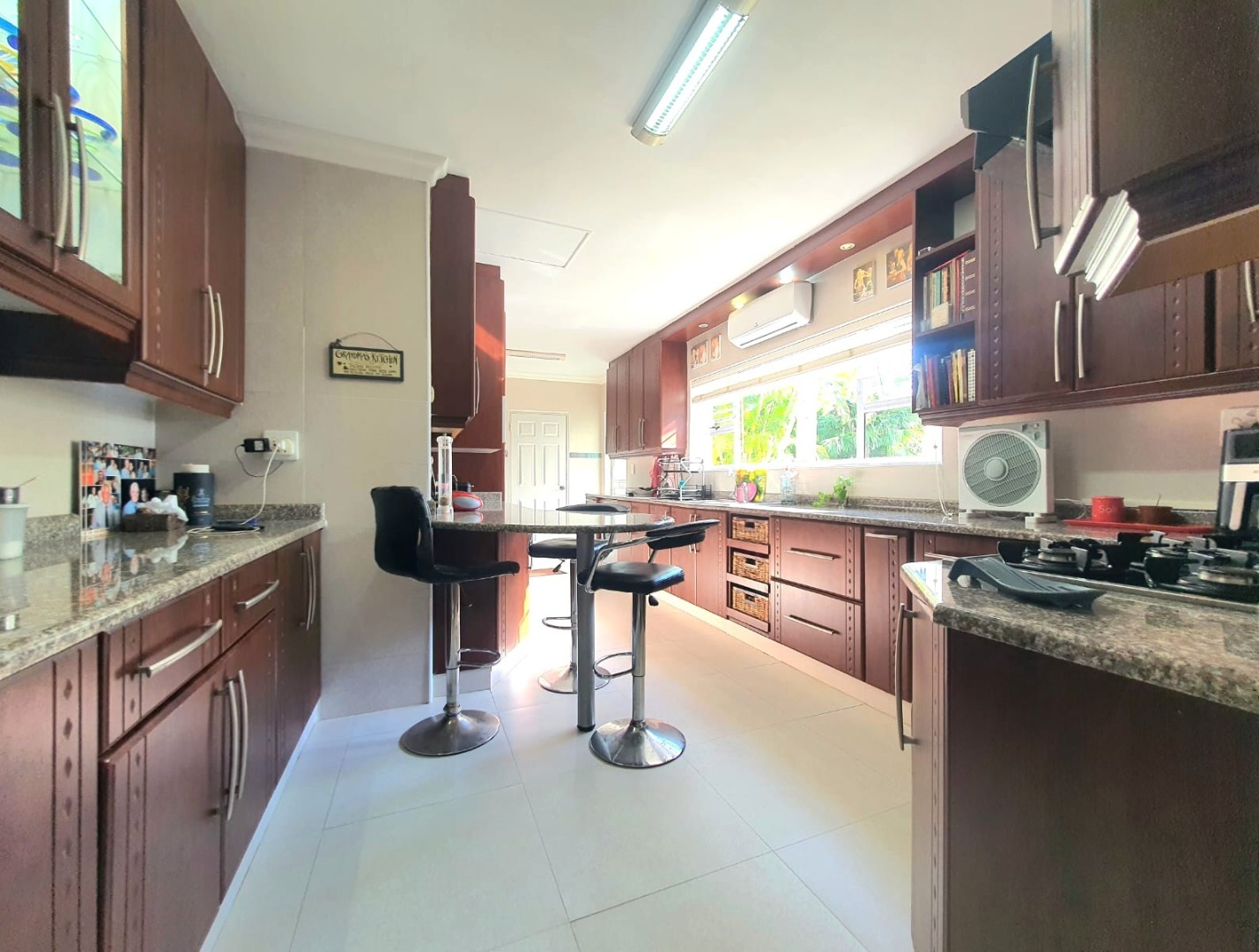 The kitchen is a highlight, boasting dark wood cabinetry, elegant granite countertops, a practical island, a built-in oven, and a gas hob, That opens up to by a convenient Pantry/Laundry .The kitchen also has air conditioning for comfort. Special doors, sliding doors, and special lights add a touch of distinction throughout the home, which also includes a dedicated laundry area and a study. The property offers four generously sized bedrooms. The Main bedroom opens onto the Balcony (with stunning sea views, features an en-suite bathroom, ensuring privacy and convenience. Two of the bedrooms open onto the Gardens and the other opens onto the Entertainment area.