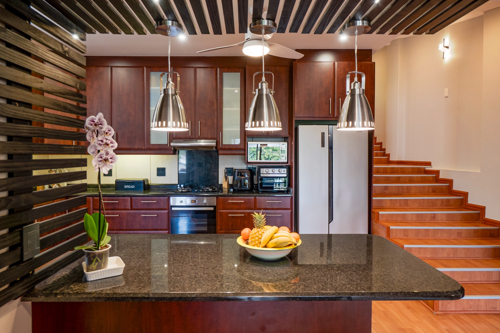The main bedroom features a walk-in closet and modern en-suite with his and hers basins. A bath for her and a shower for him completes this picture, while a second stylish bathroom serves the rest of the household.
