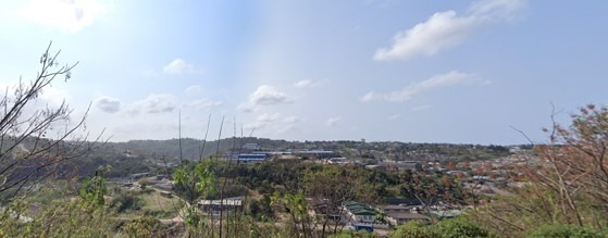 * Panoramic views of settlement and hills