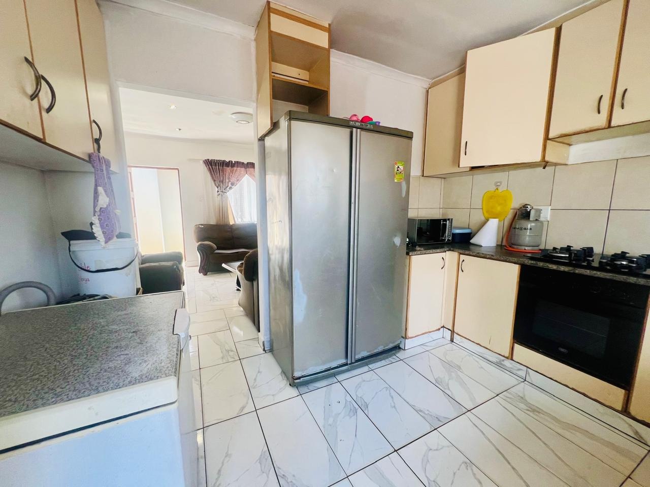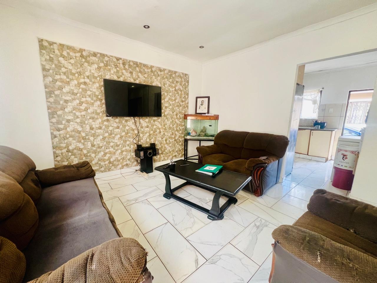 The kitchen boasts ample built-in cupboards and a gas stove, making it perfect for cooking enthusiasts. Adjacent to the kitchen, you'll find a cozy lounge adorned with a beautiful feature wall that opens to the outdoors, creating a seamless flow for entertaining or relaxing.