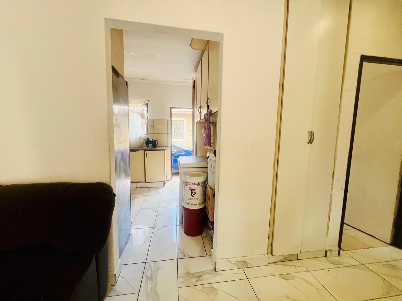 The kitchen boasts ample built-in cupboards and a gas stove, making it perfect for cooking enthusiasts. Adjacent to the kitchen, you'll find a cozy lounge adorned with a beautiful feature wall that opens to the outdoors, creating a seamless flow for entertaining or relaxing.