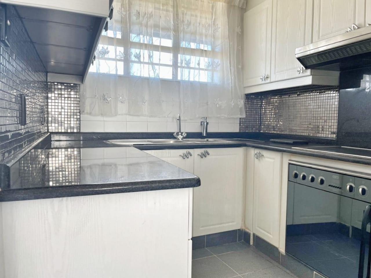 The interior features an open-plan layout, seamlessly connecting the living spaces. The property includes a dedicated lounge and a dining room. The kitchen is well-appointed with modern integrated appliances, including a hob, oven, and extractor fan, complemented by white cabinetry and dark countertops, offering both functionality and style. Tiled flooring extends throughout the living areas, ensuring durability and ease of maintenance.