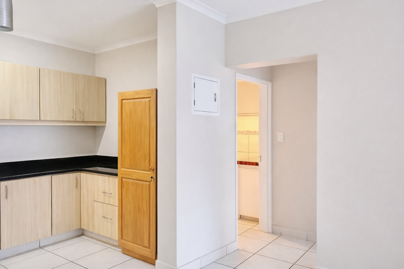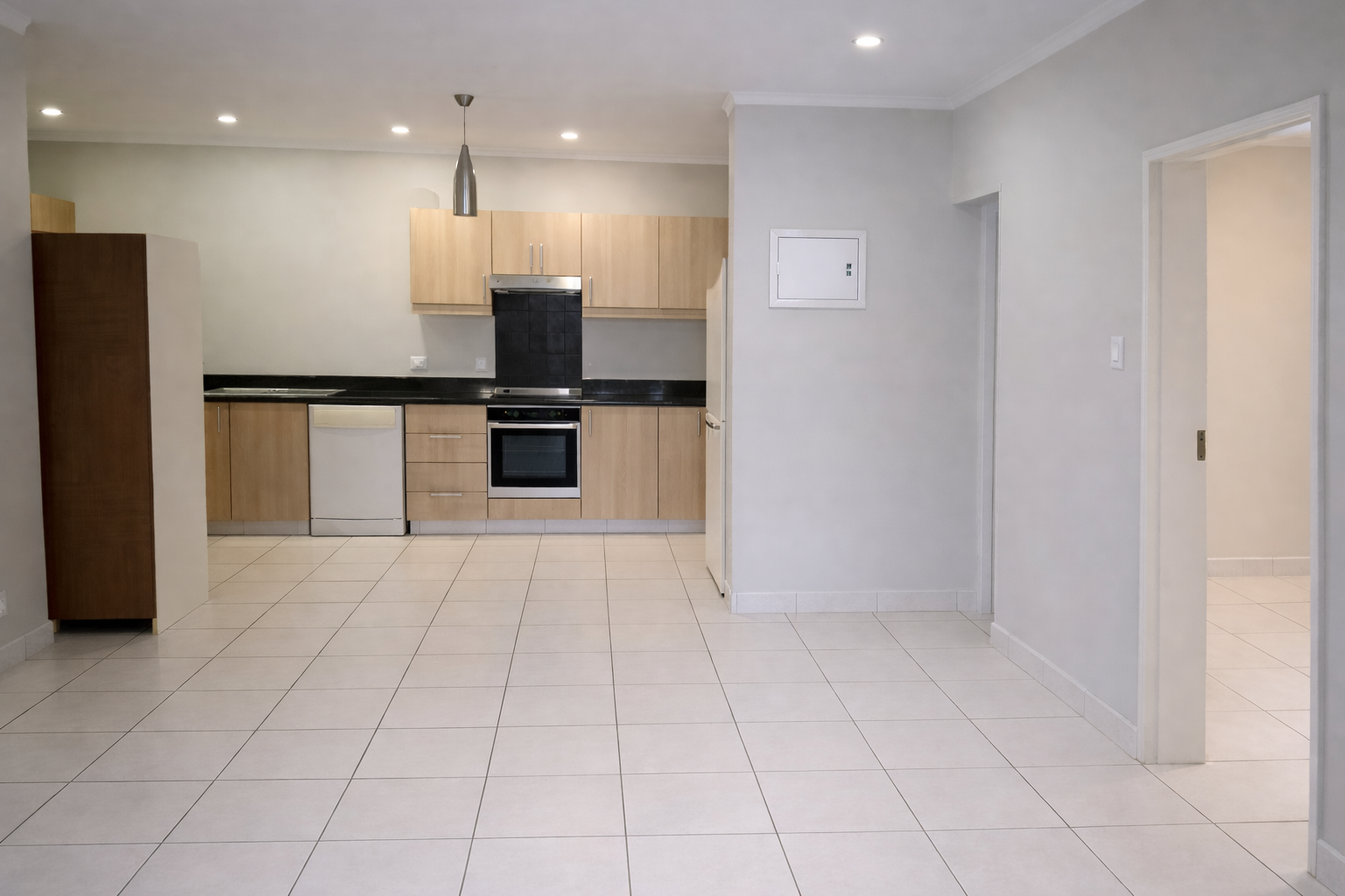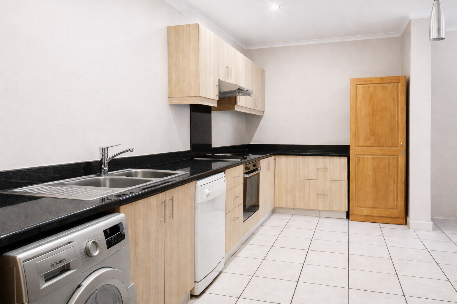 Step inside to a light-filled open-plan design enhanced by neutral tones that create a bright, airy, and welcoming atmosphere. The contemporary kitchen features light wood cabinetry, granite countertops, an under-counter oven, glass hob, extractor fan, and plumbing for both a dishwasher and washing machine. This functional yet stylish space flows seamlessly into the lounge and dining area, making it ideal for comfortable everyday living as well as relaxed entertaining.
