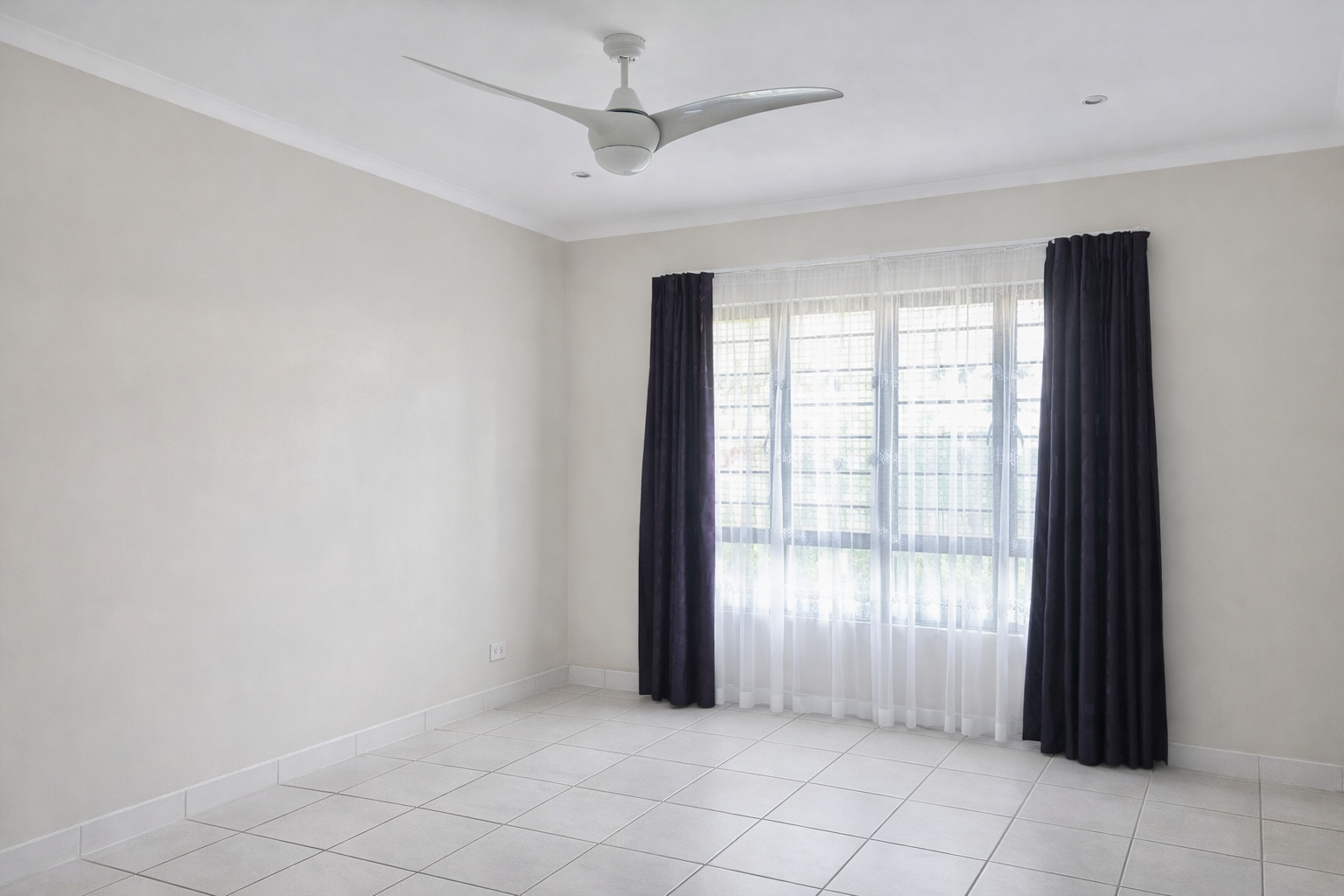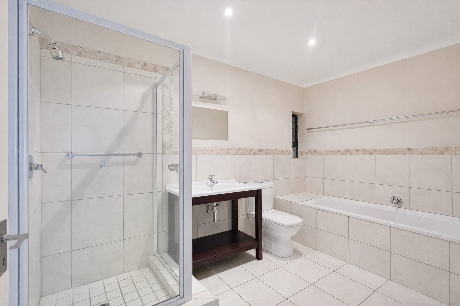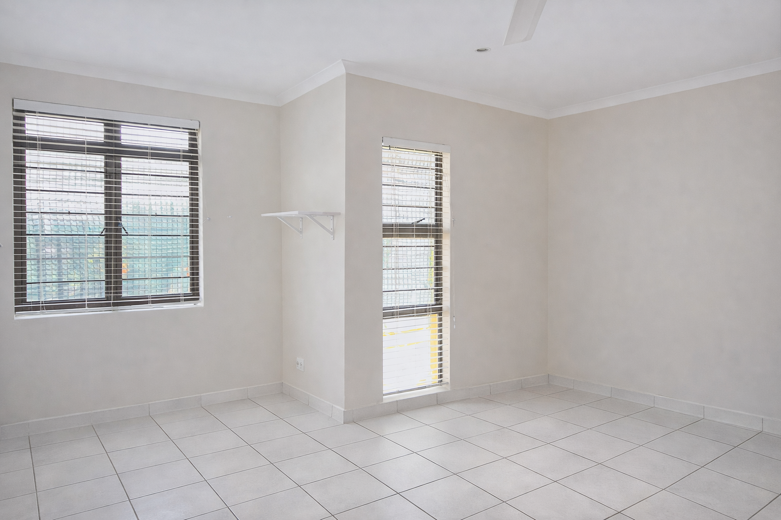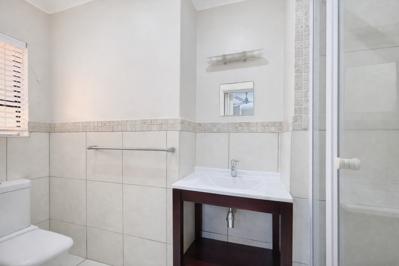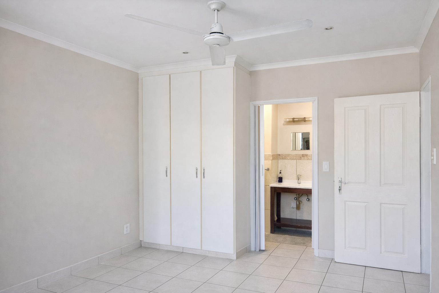 The apartment offers two well-sized bedrooms, both fitted with built-in cupboards and ceiling fans to ensure comfort year-round. The main bedroom enjoys the added benefit of a private en-suite bathroom, while the second family bathroom conveniently offers both a bath and shower.