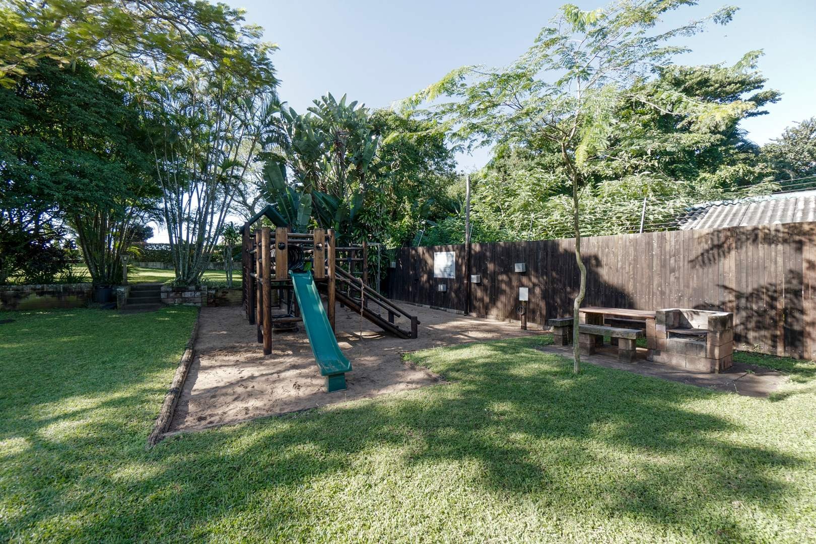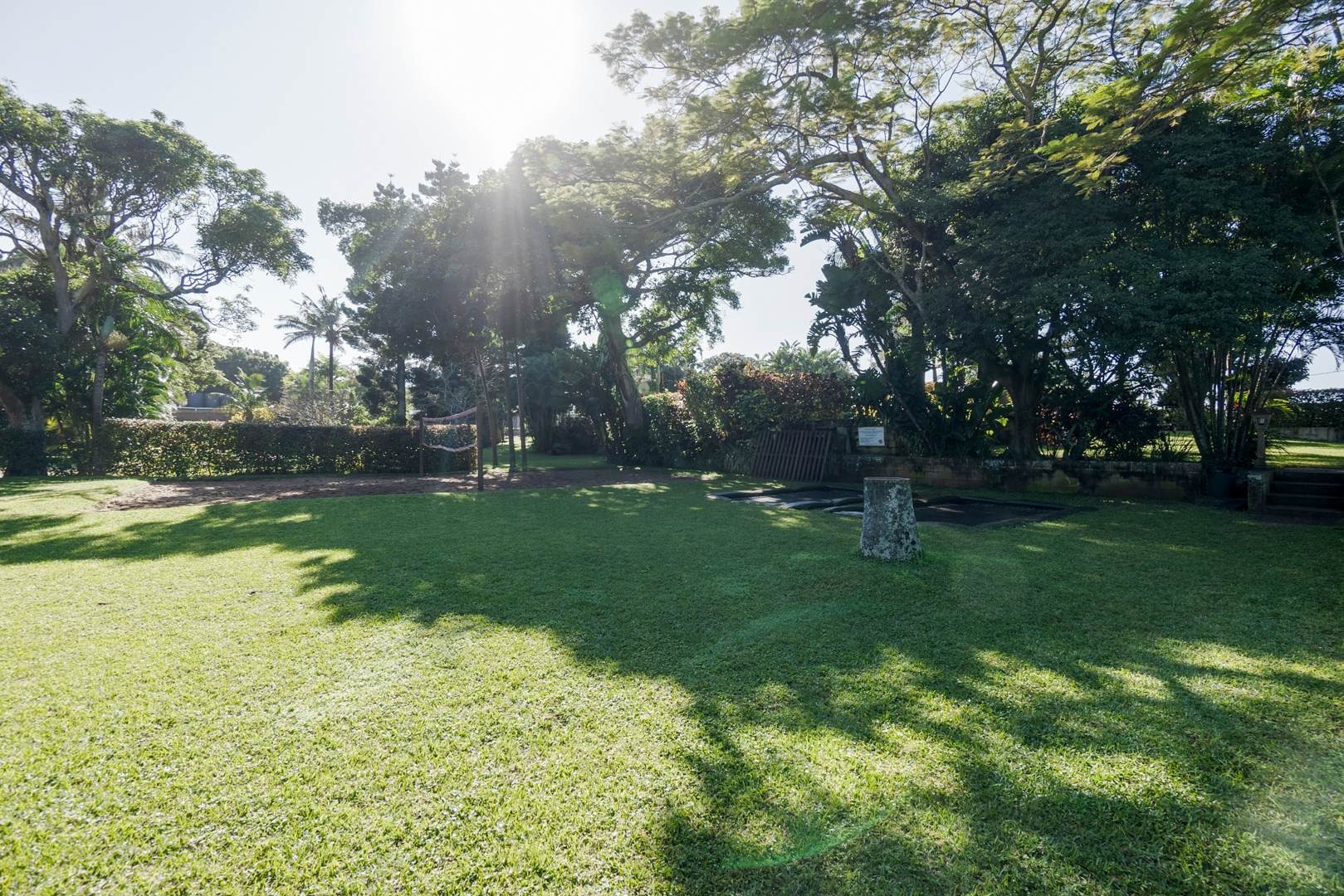 – Children’s garden play zone with jungle gym and trampolines.