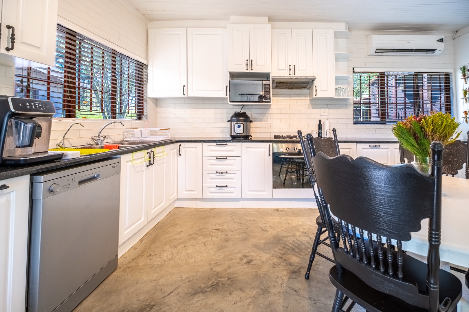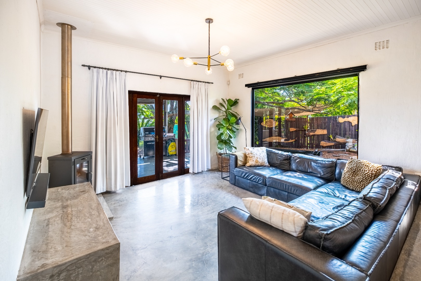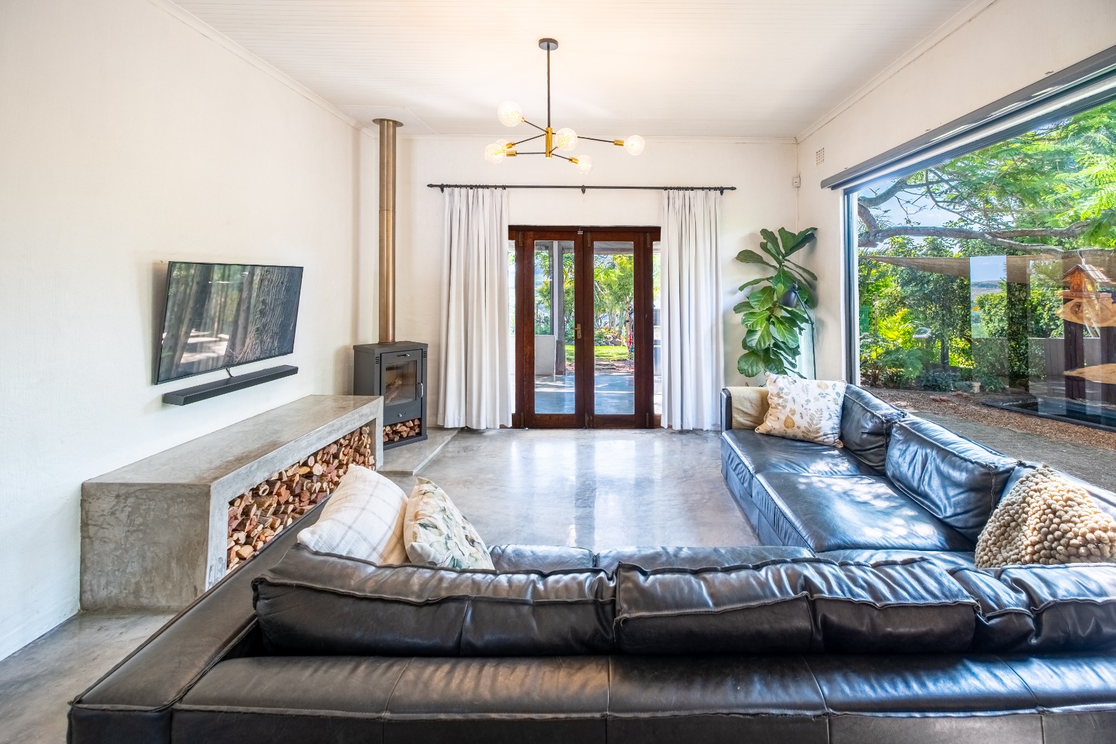 Discover this charming 3-bedroom, 2-bathroom home nestled in the serene suburb of Lower Illovo, offering a tranquil country living experience with breathtaking scenic views. The residence boasts an inviting open-plan layout, featuring modern polished concrete flooring throughout, complemented by air conditioning for year-round comfort. The spacious lounge is a focal point, complete with a contemporary wood-burning stove and large glass doors that seamlessly connect indoor and outdoor living spaces, providing lush green views.