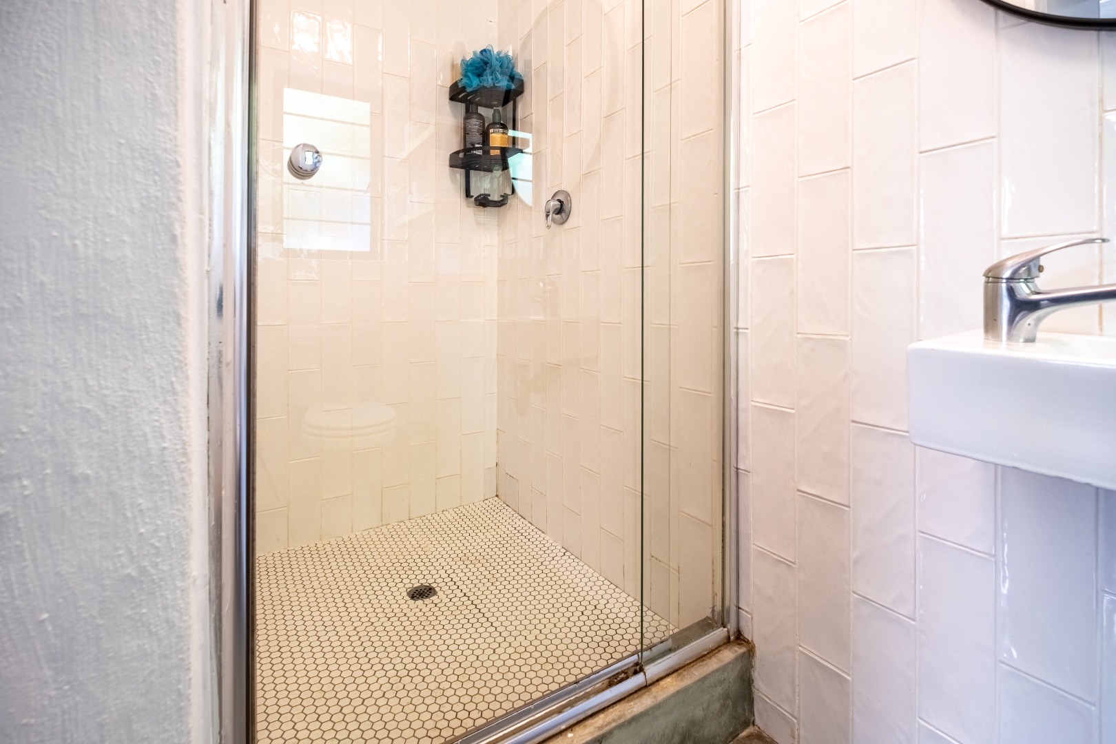 The heart of this home is its bright, modern kitchen, equipped with elegant white shaker-style cabinetry, sleek black countertops, and a classic white subway tile backsplash. A dedicated laundry area adds to the home's practicality.