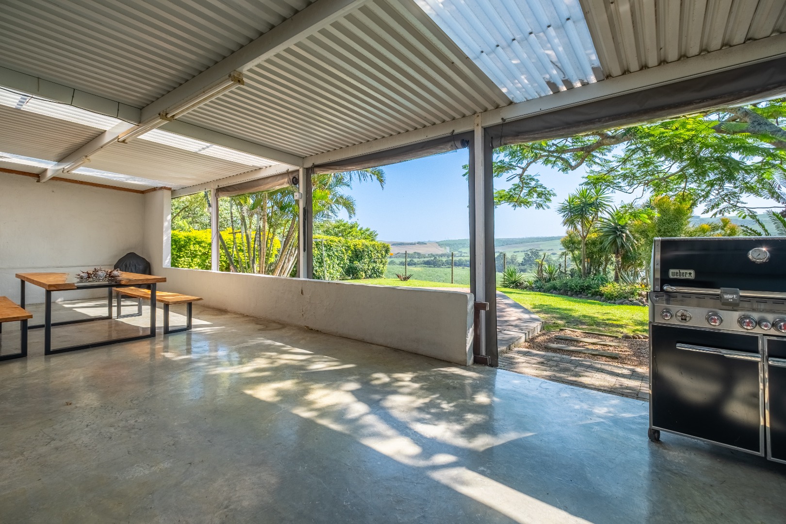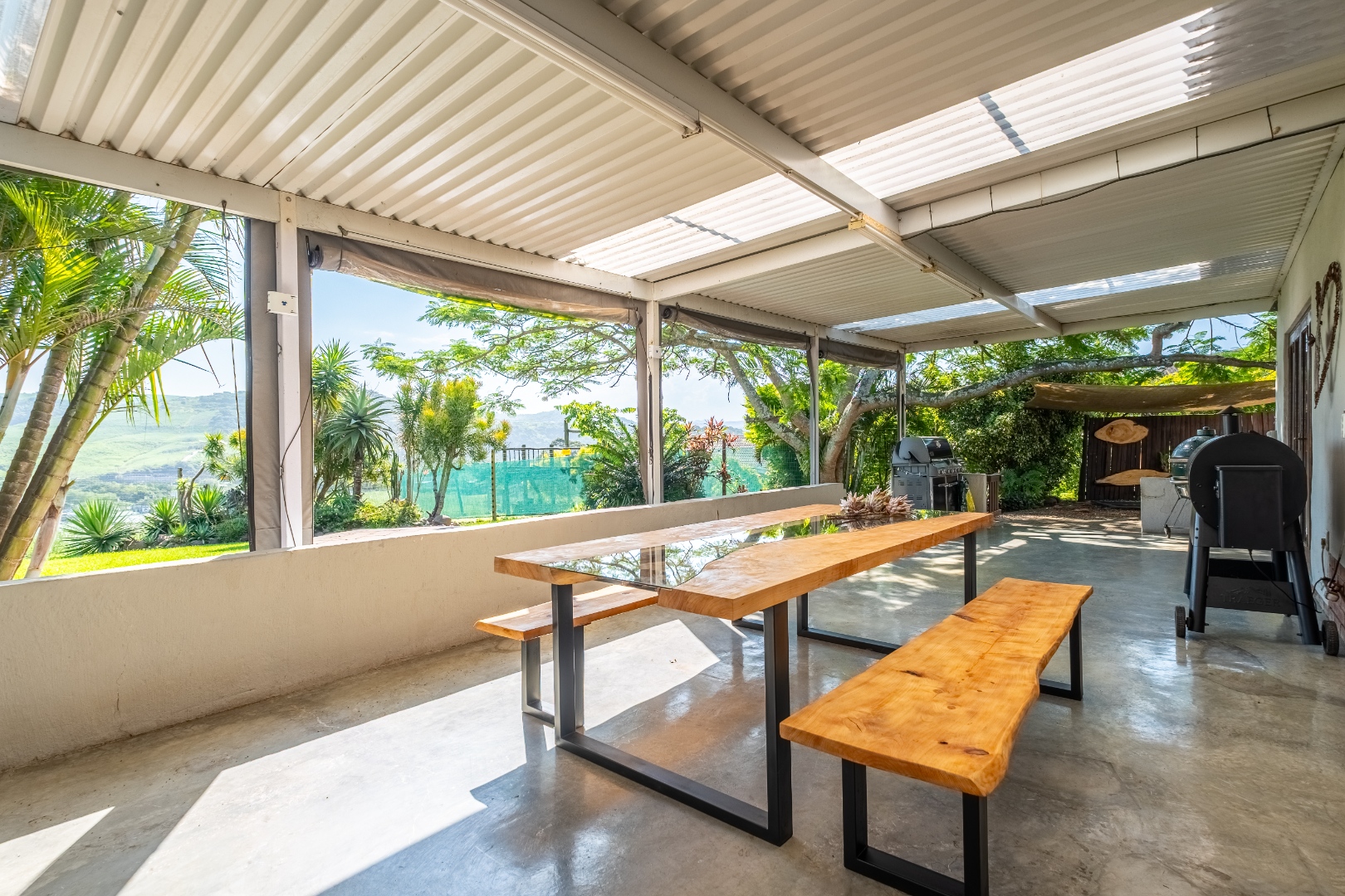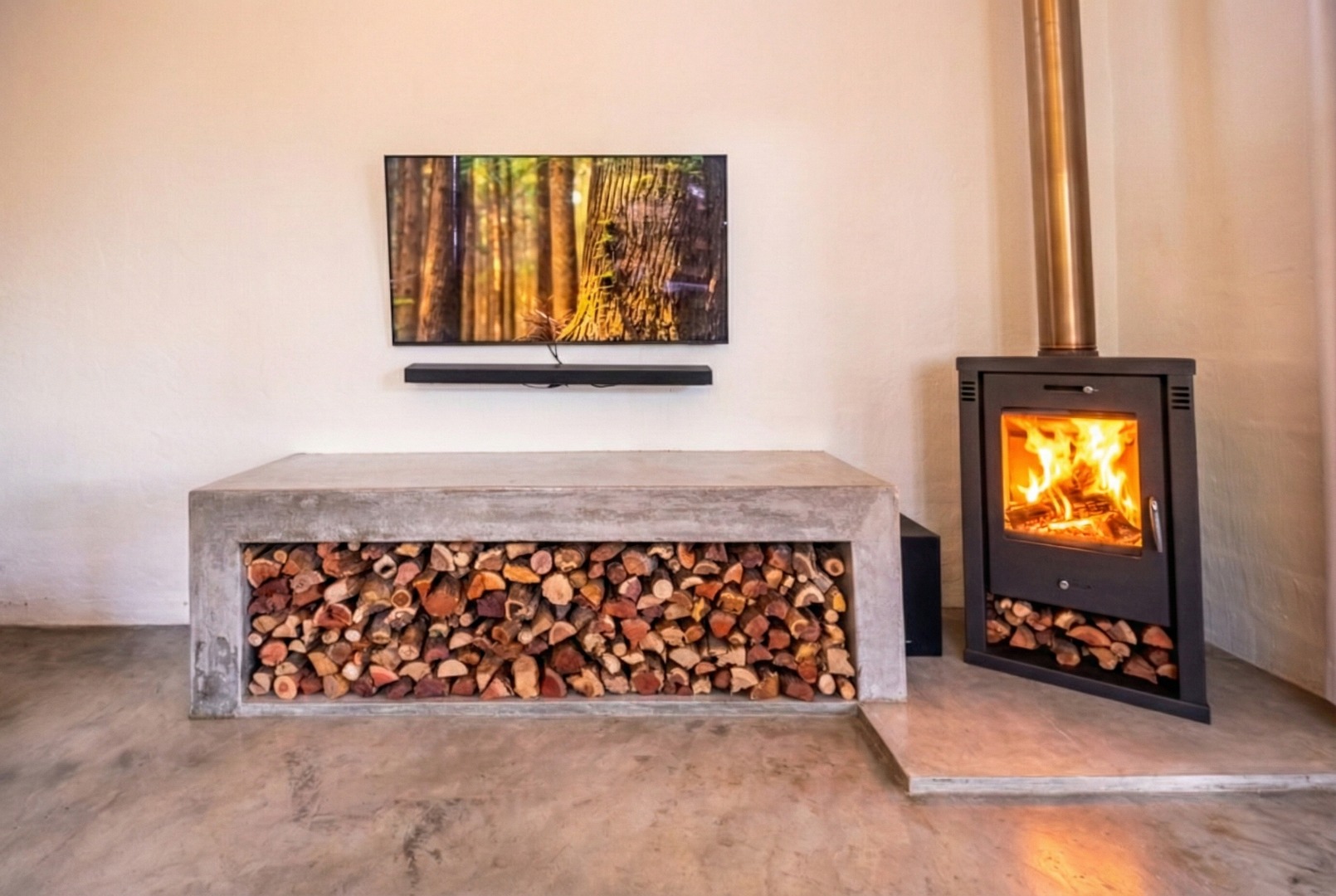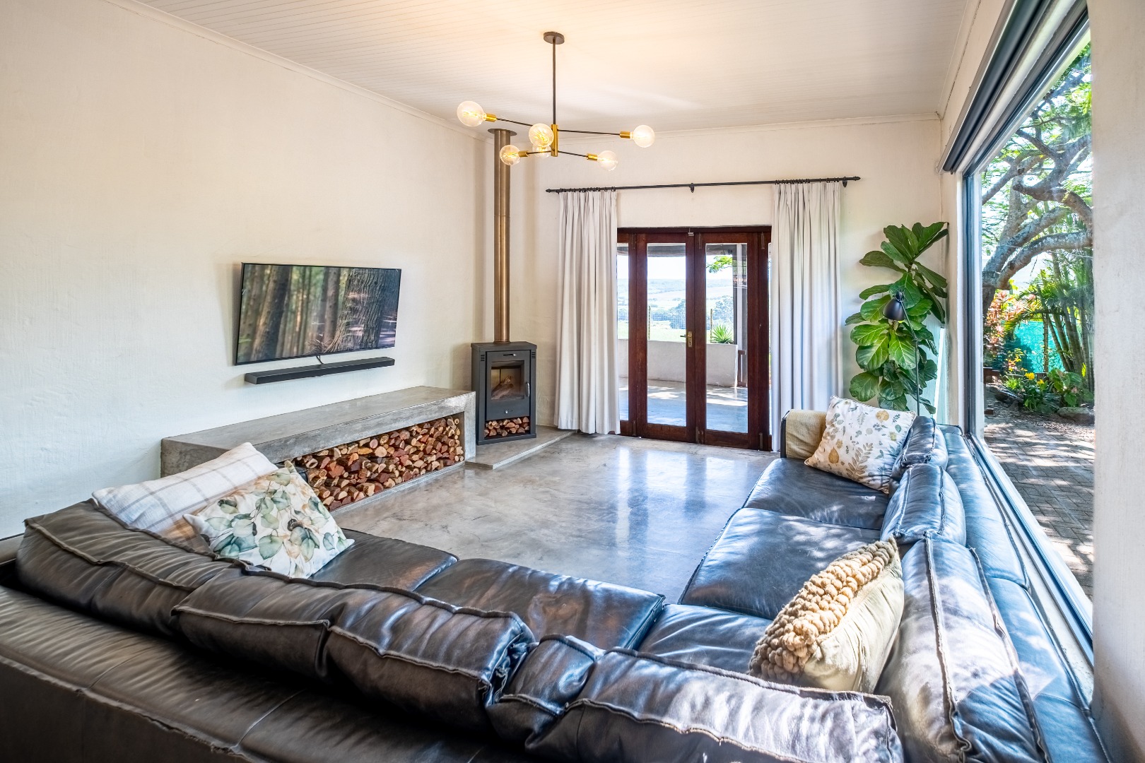 Discover this charming 3-bedroom, 2-bathroom home nestled in the serene suburb of Lower Illovo, offering a tranquil country living experience with breathtaking scenic views. The residence boasts an inviting open-plan layout, featuring modern polished concrete flooring throughout, complemented by air conditioning for year-round comfort. The spacious lounge is a focal point, complete with a contemporary wood-burning stove and large glass doors that seamlessly connect indoor and outdoor living spaces, providing lush green views.