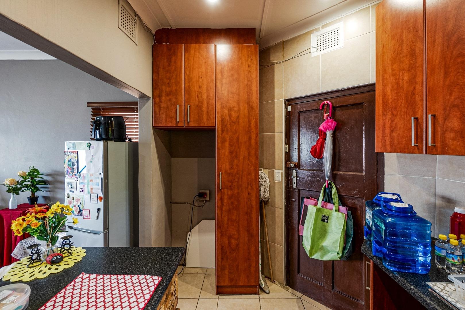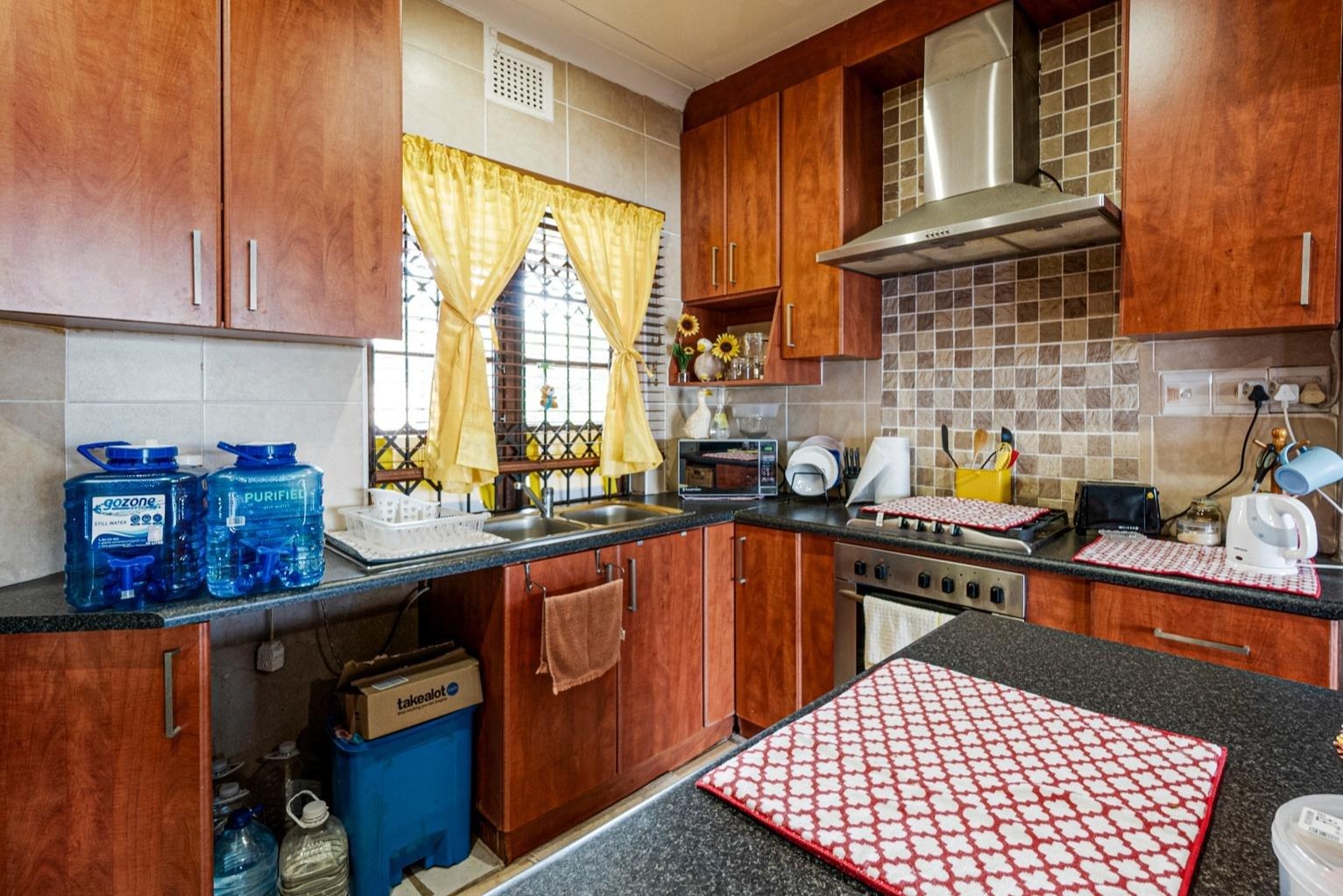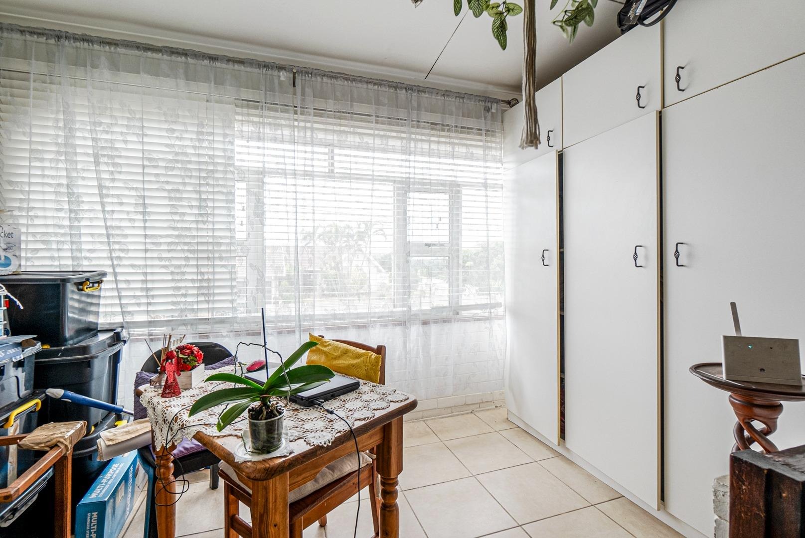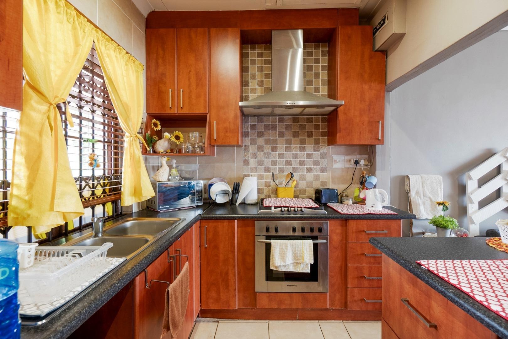 The spacious lounge, complete with a ceiling fan and wooden floors, flows seamlessly into a stylish cherrywood kitchen, featuring a built-in gas hob with an extractor fan and a centre island as prep area. Ample cupboards are found. The tiled enclosed balcony extending from the lounge, serves as a versatile space—ideal as an office, study, or additional sleeping area—with built-in cupboards for extra storage.