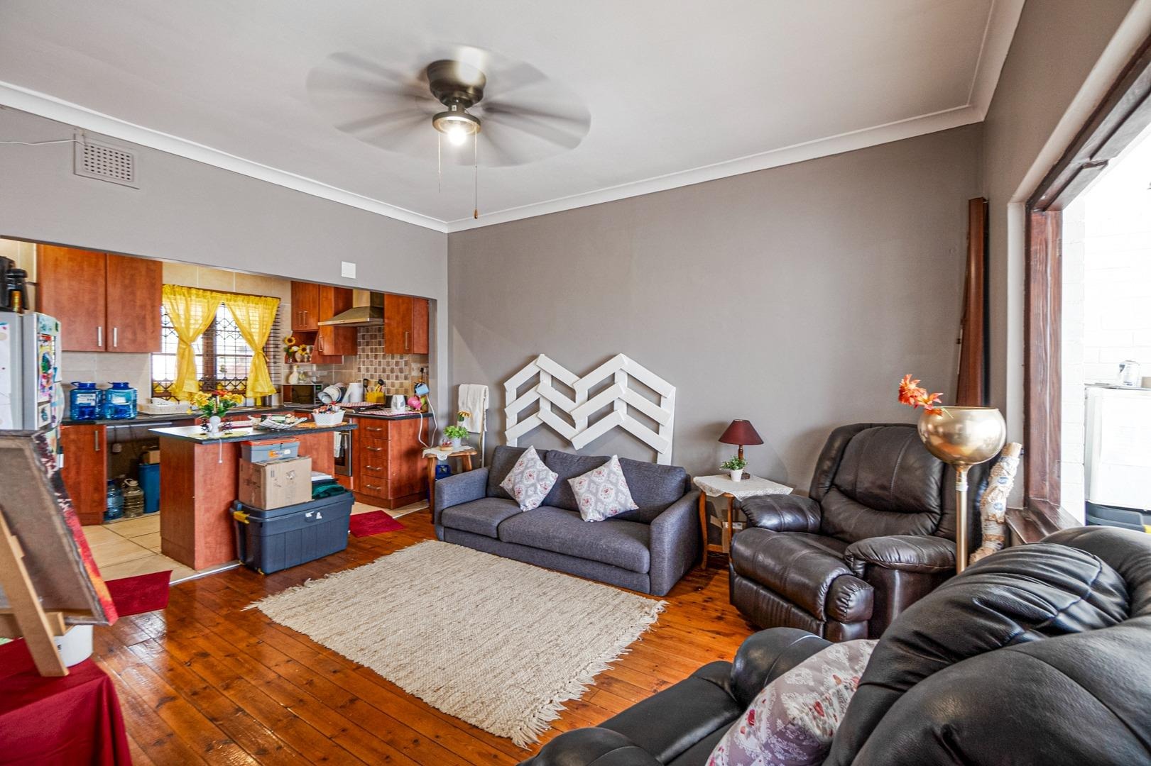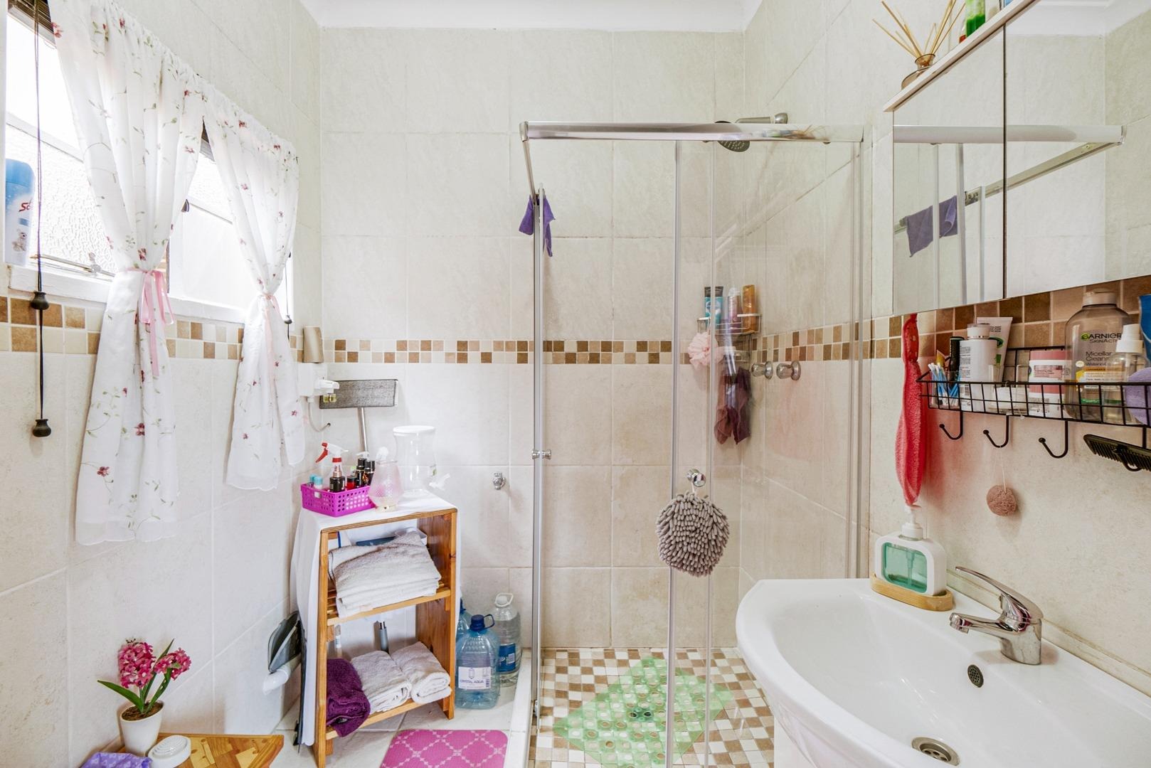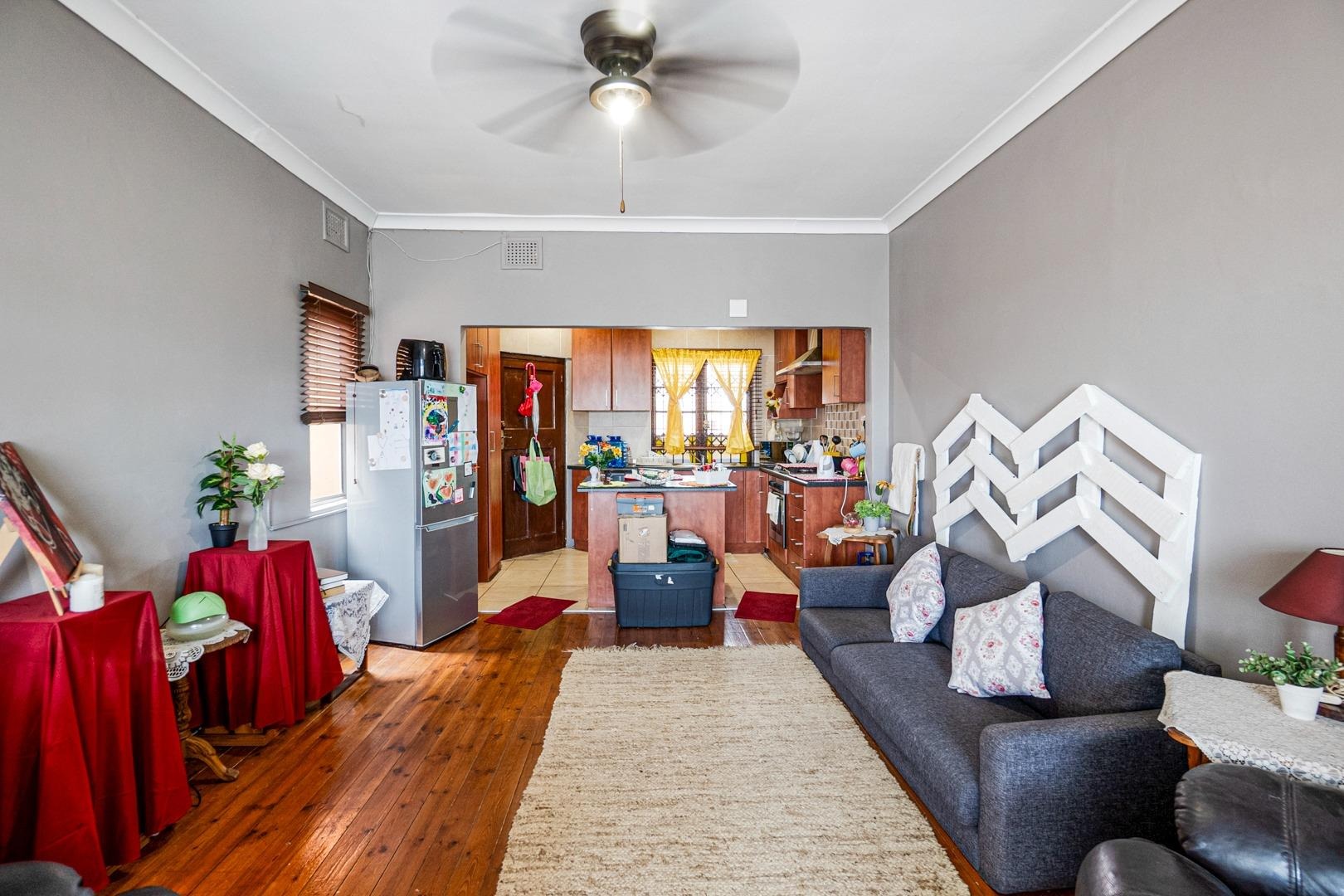 The spacious lounge, complete with a ceiling fan and wooden floors, flows seamlessly into a stylish cherrywood kitchen, featuring a built-in gas hob with an extractor fan and a centre island as prep area. Ample cupboards are found. The tiled enclosed balcony extending from the lounge, serves as a versatile space—ideal as an office, study, or additional sleeping area—with built-in cupboards for extra storage.