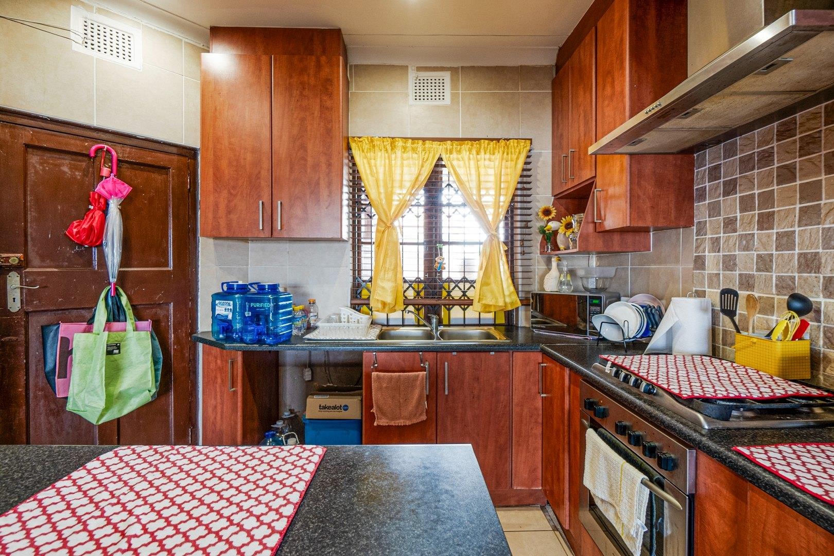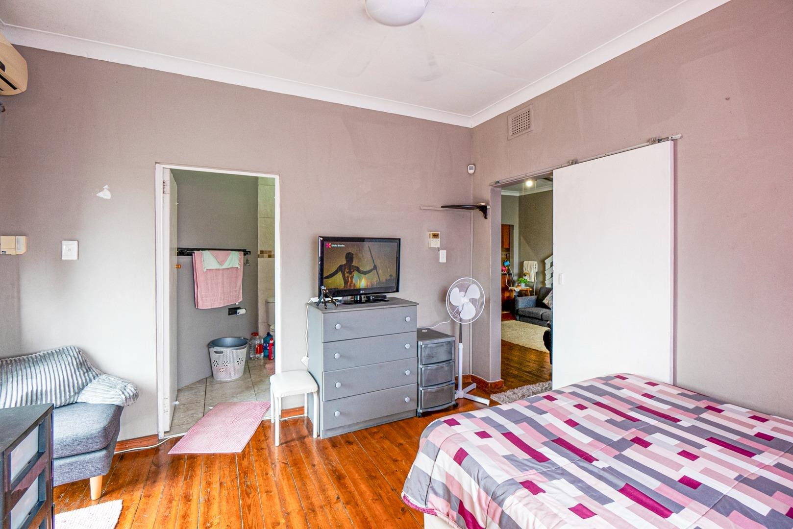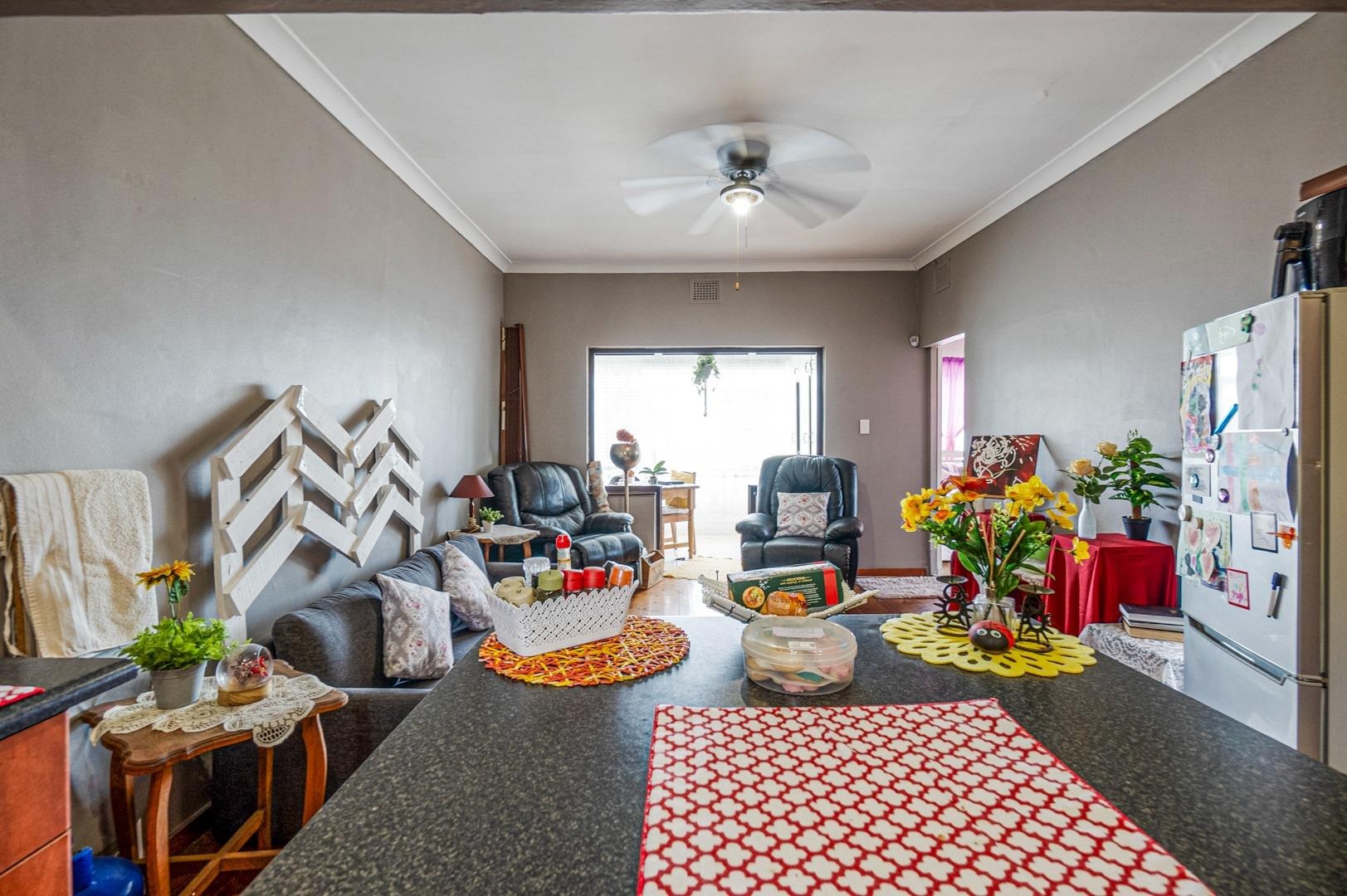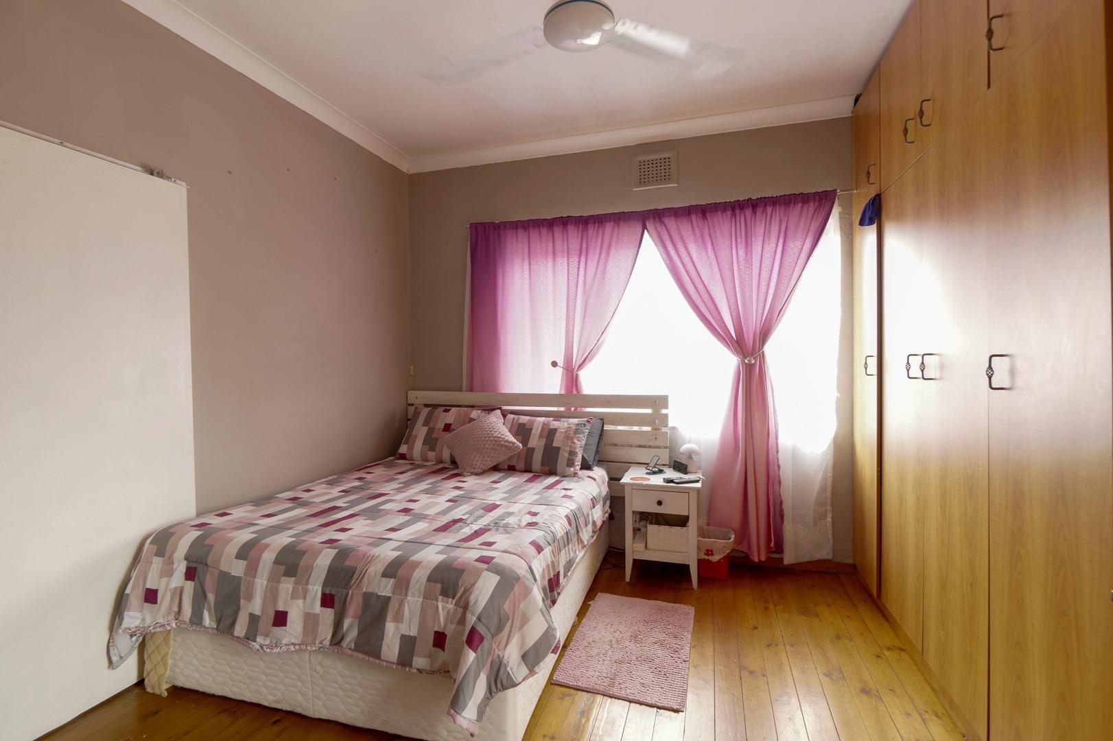 The spacious lounge, complete with a ceiling fan and wooden floors, flows seamlessly into a stylish cherrywood kitchen, featuring a built-in gas hob with an extractor fan and a centre island as prep area. Ample cupboards are found. The tiled enclosed balcony extending from the lounge, serves as a versatile space—ideal as an office, study, or additional sleeping area—with built-in cupboards for extra storage.