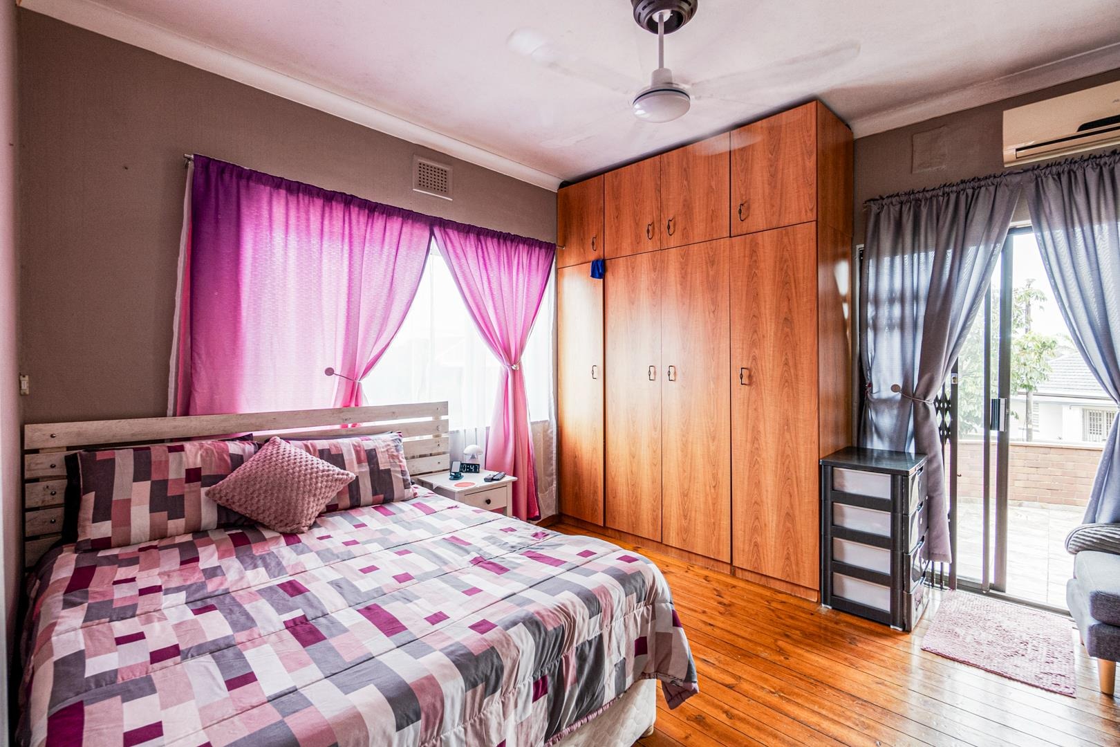 Featuring beautiful wooden floors, built-in cupboards and air conditioning, the generously sized bedroom opens onto a corner balcony with peaceful views, while the en-suite bathroom includes a shower, basin, and toilet.