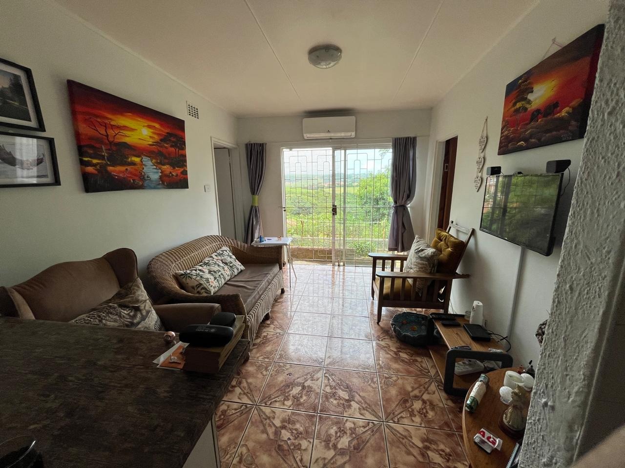 The interior features an open-plan layout, seamlessly connectingthe living spaces. The lounge area, equipped with air conditioning and a ceiling fan, tiled flooring, enhanced by natural light streaming through sliding glass doors that lead to the outdoors.