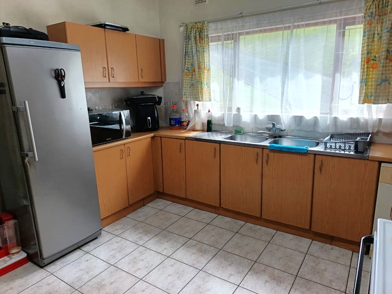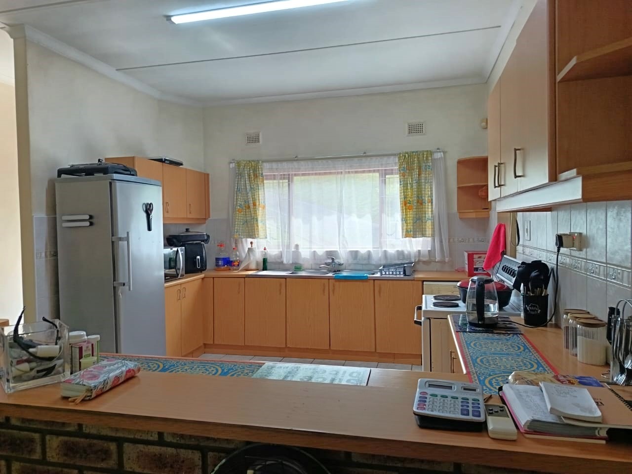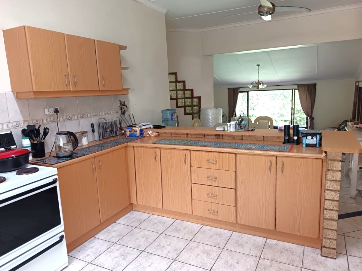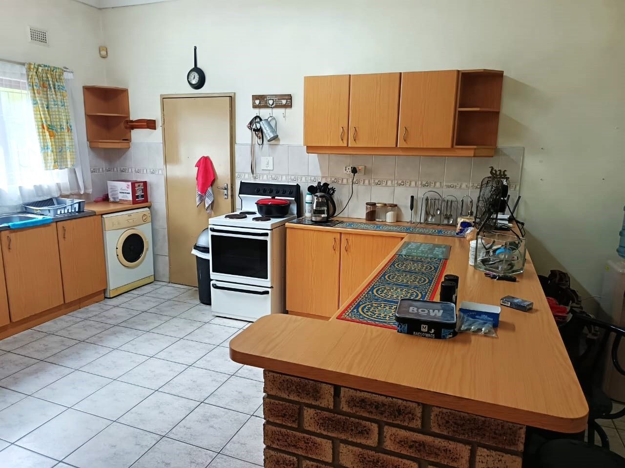 The bright, open-plan kitchen offers ample cupboard space and