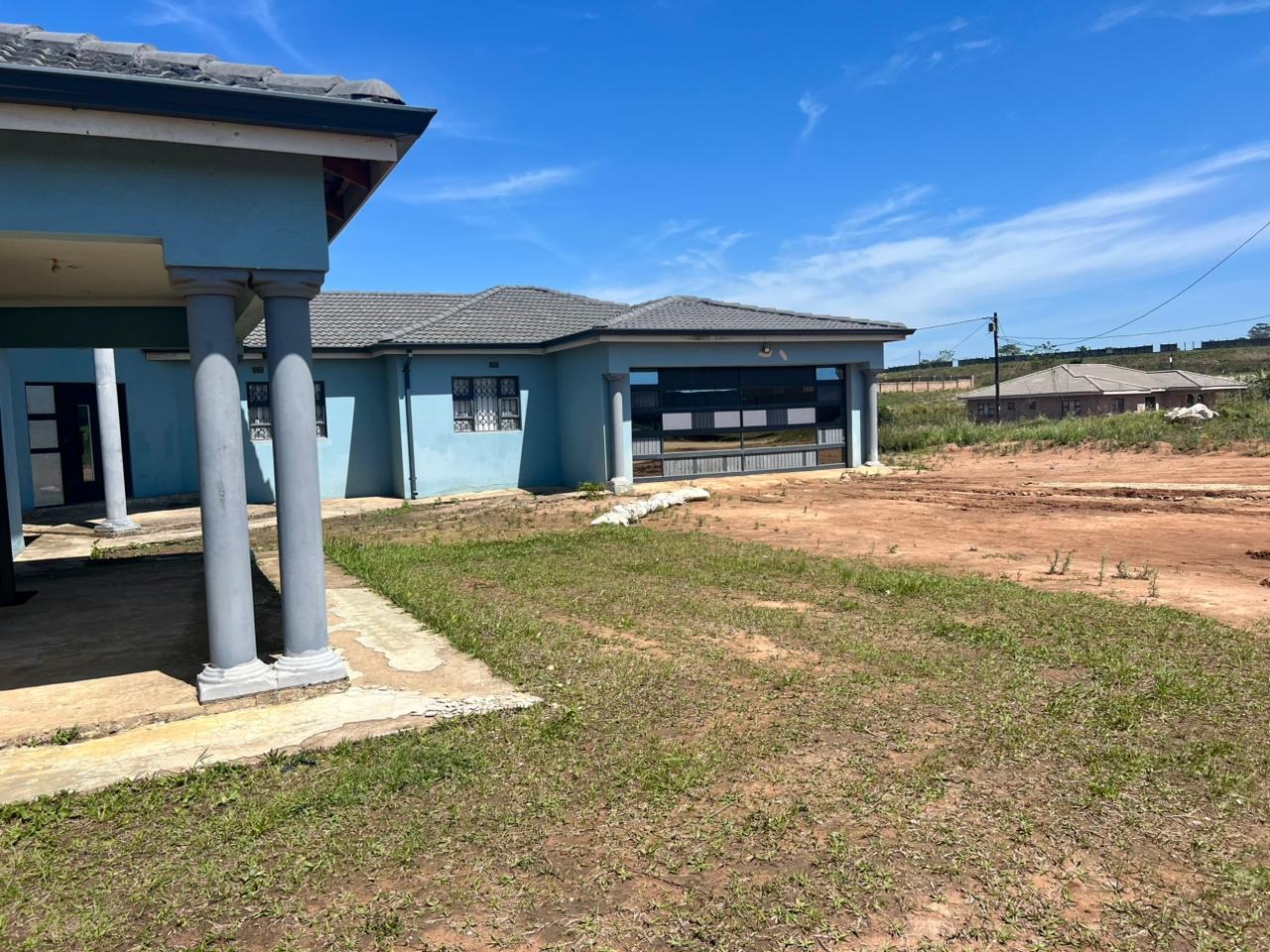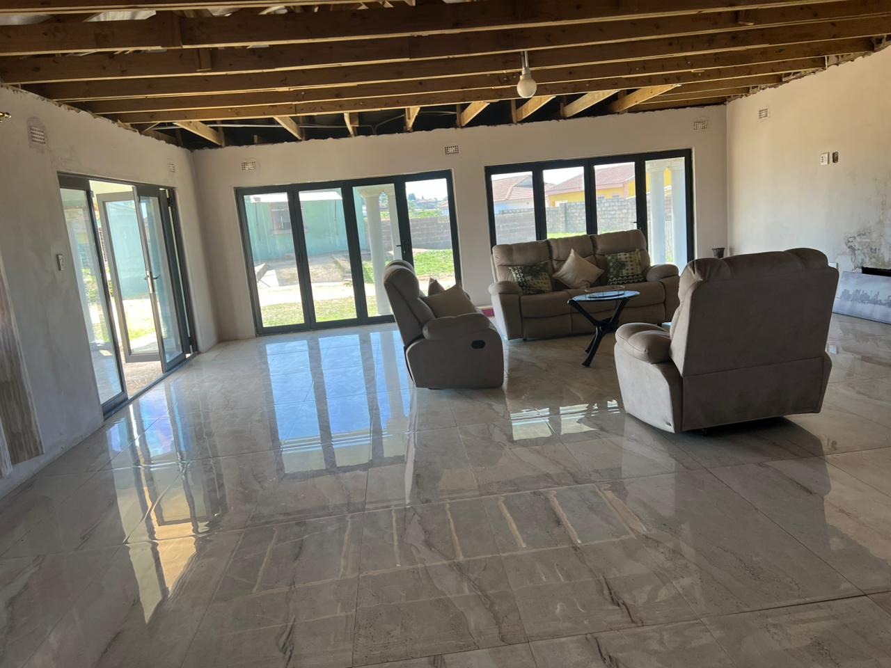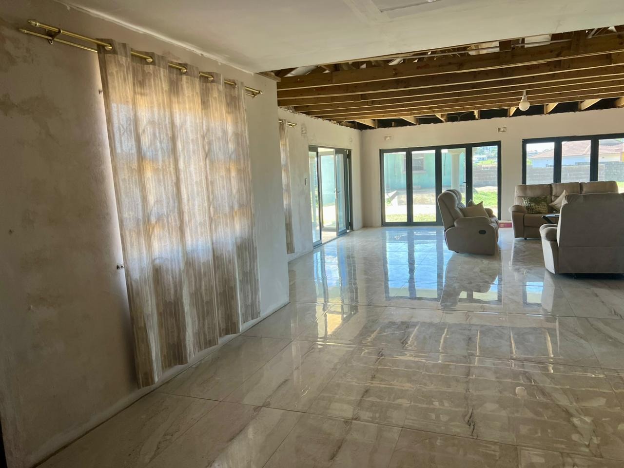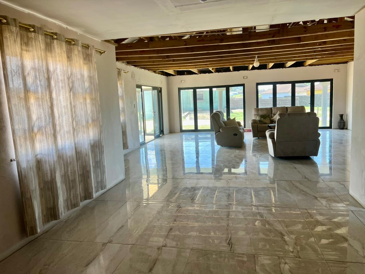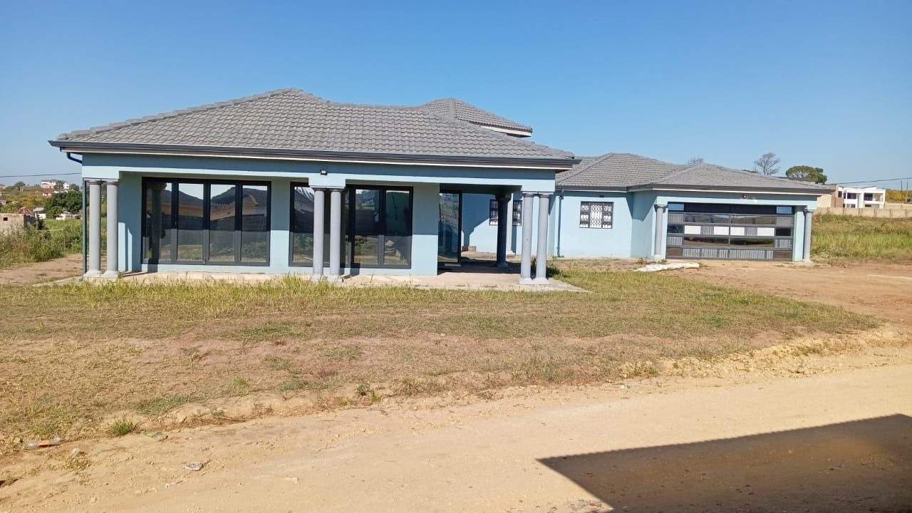 This modern, light blue single-story residence in Adams Mission although not complete presents a distinctive architectural design with a central entrance tower and a contemporary grey tiled roof. Large glass doors and windows enhance the facade, promising abundant natural light within. Situated in a developing area, the property offers a scenic view and a tranquil setting, ideal for those seeking a peaceful lifestyle.