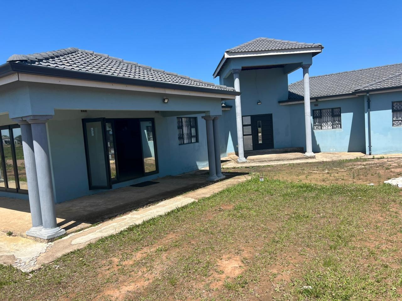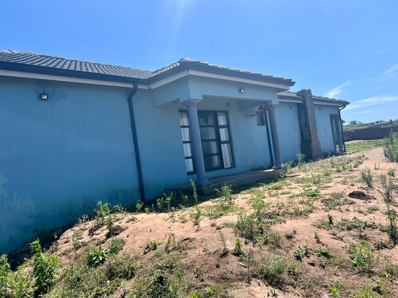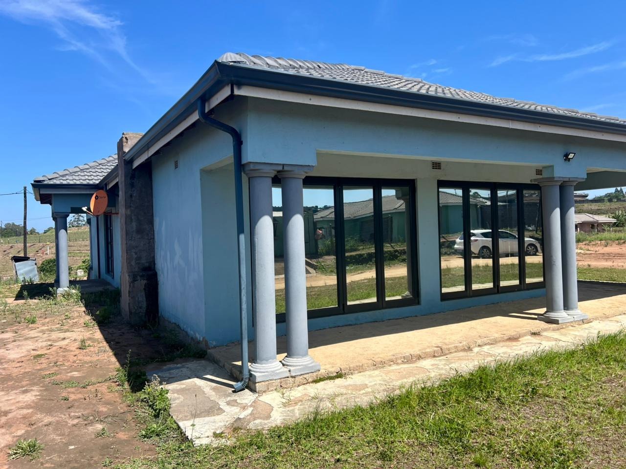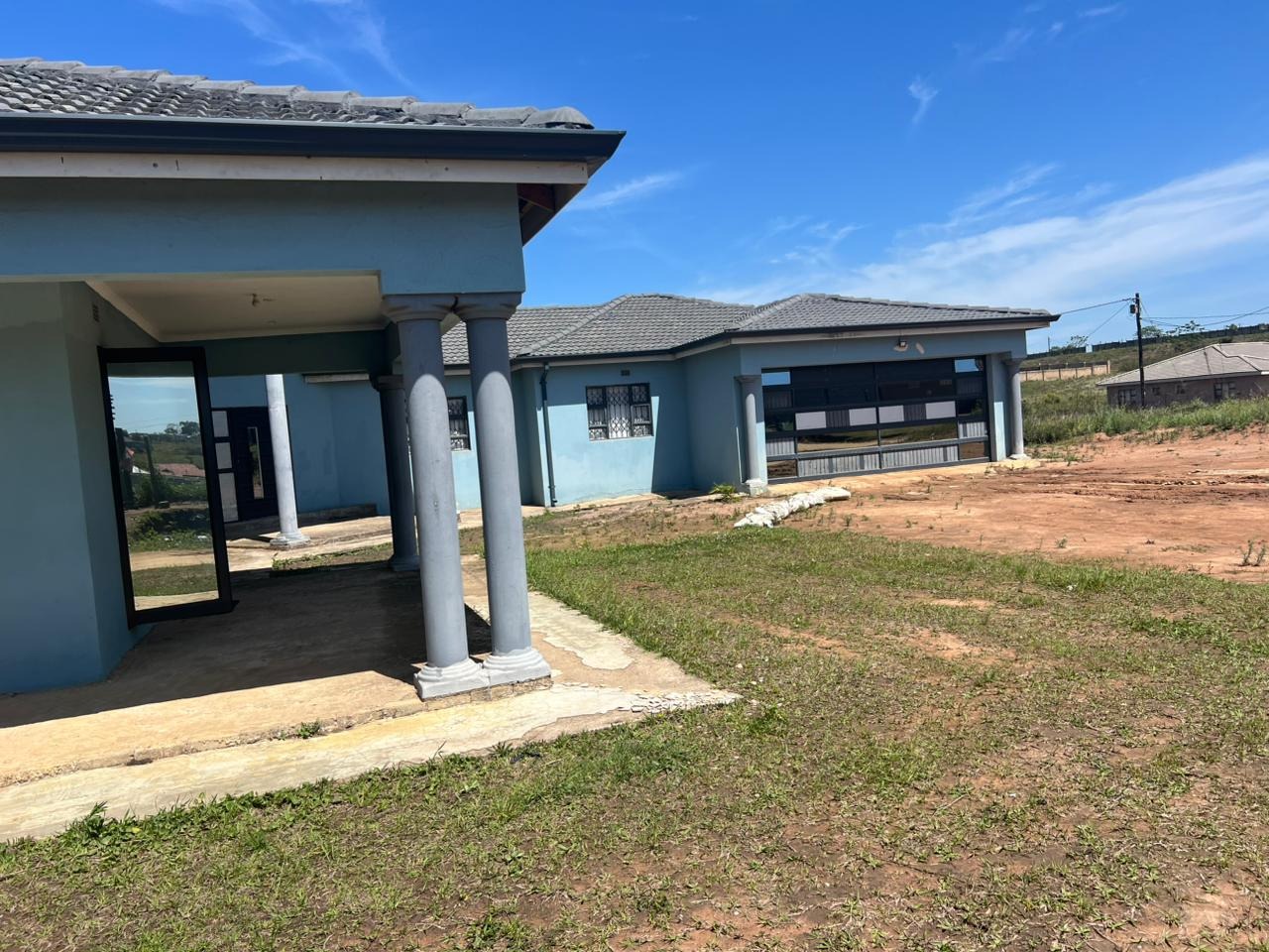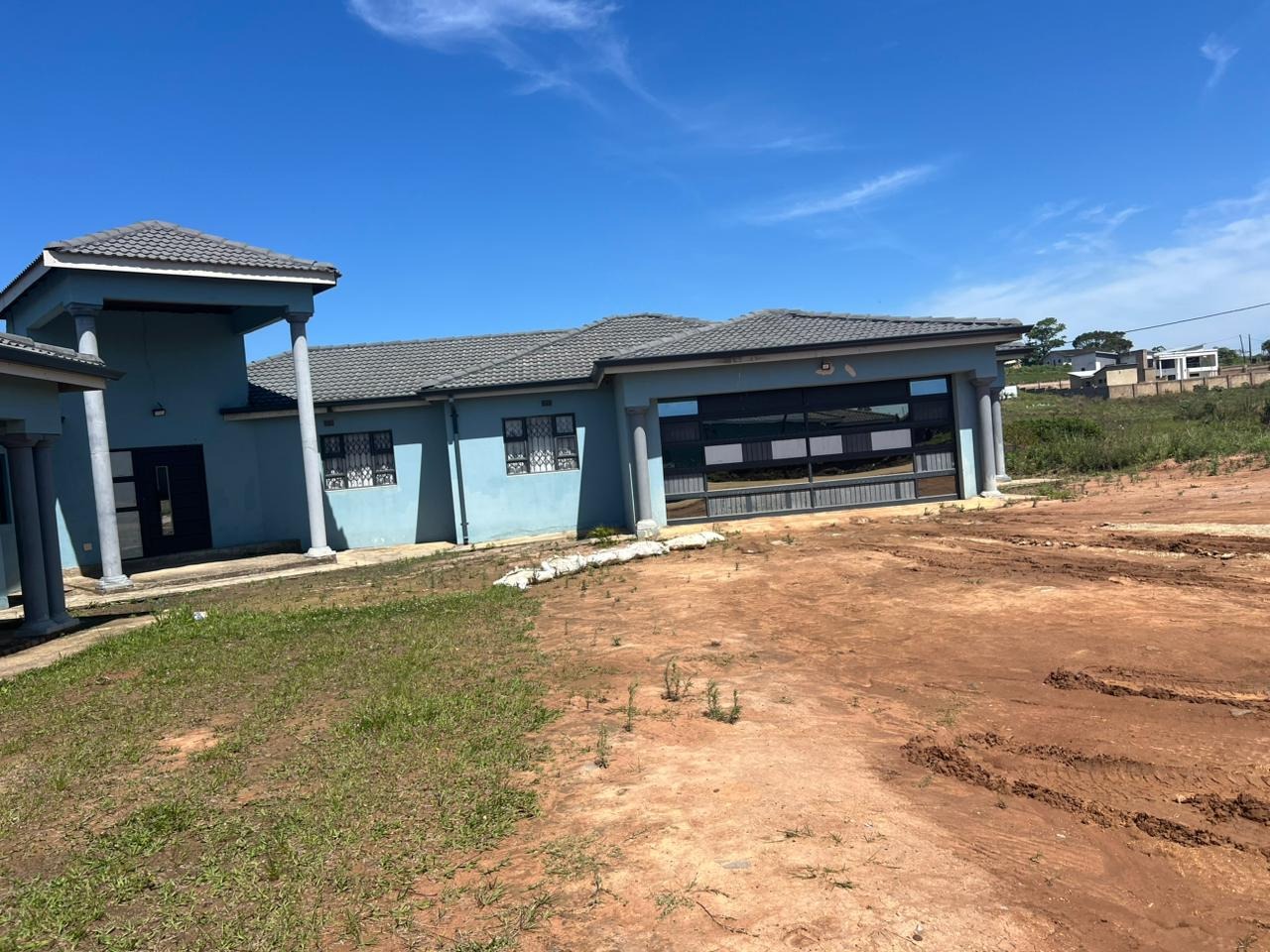 This modern, light blue single-story residence in Adams Mission although not complete presents a distinctive architectural design with a central entrance tower and a contemporary grey tiled roof. Large glass doors and windows enhance the facade, promising abundant natural light within. Situated in a developing area, the property offers a scenic view and a tranquil setting, ideal for those seeking a peaceful lifestyle.
