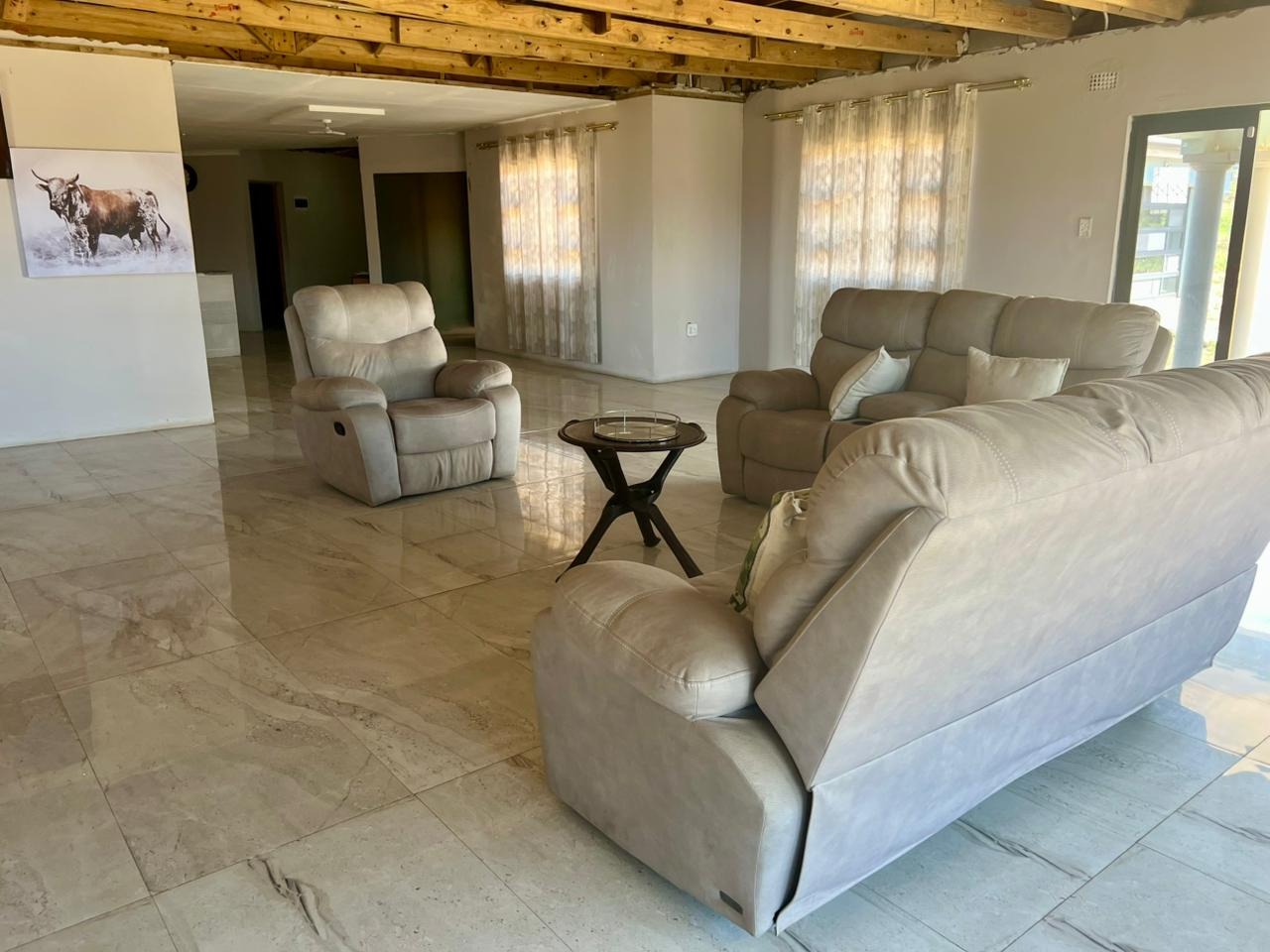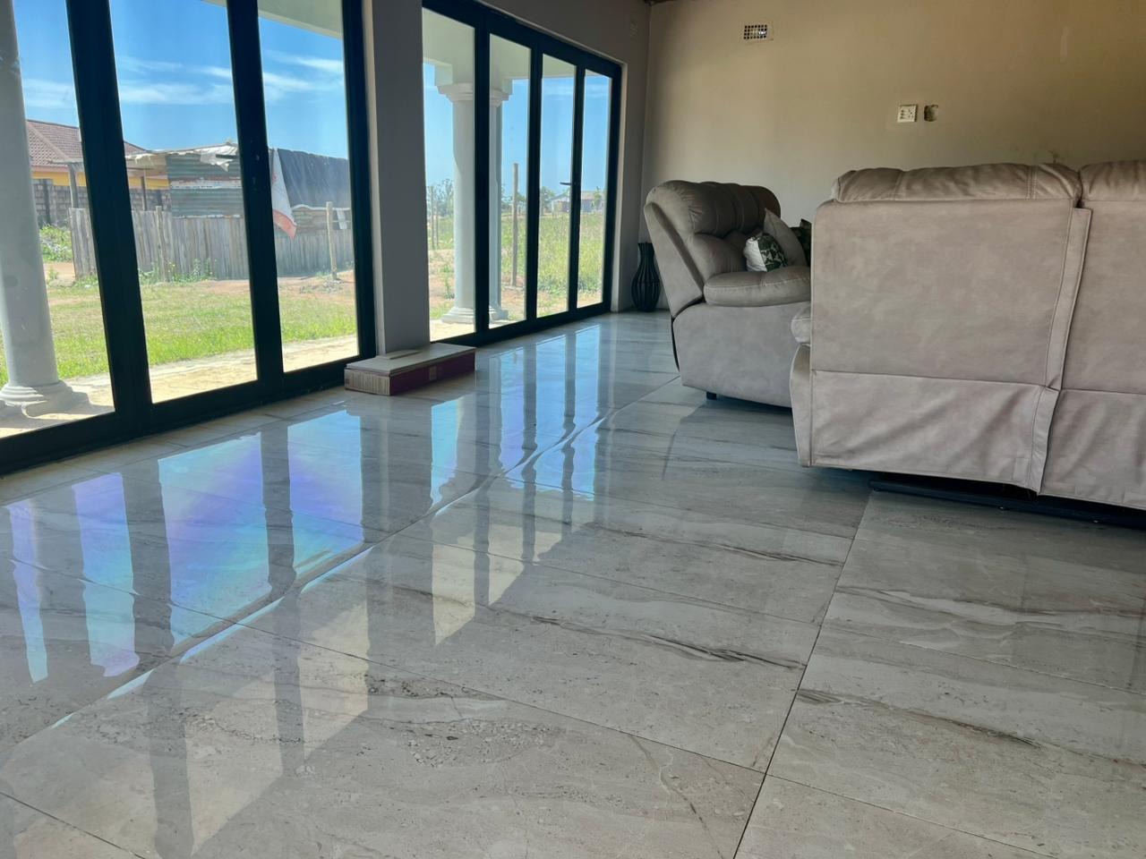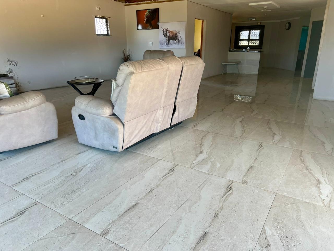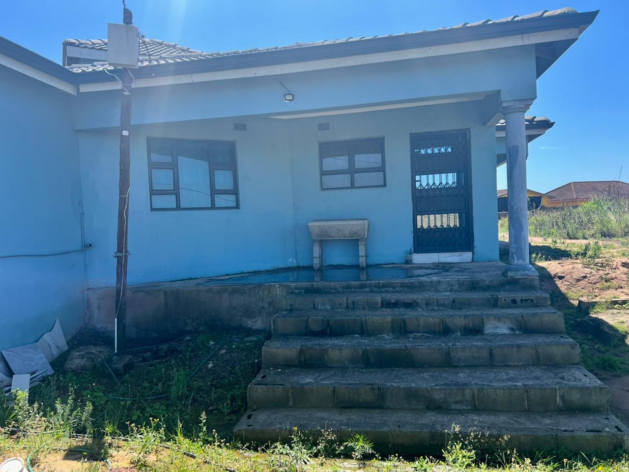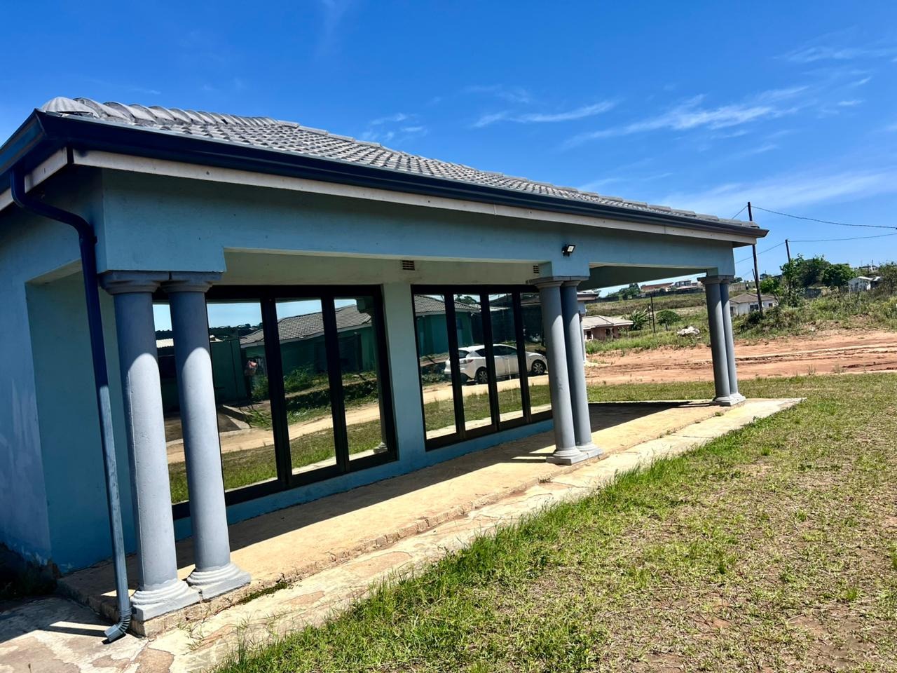 This modern, light blue single-story residence in Adams Mission although not complete presents a distinctive architectural design with a central entrance tower and a contemporary grey tiled roof. Large glass doors and windows enhance the facade, promising abundant natural light within. Situated in a developing area, the property offers a scenic view and a tranquil setting, ideal for those seeking a peaceful lifestyle.