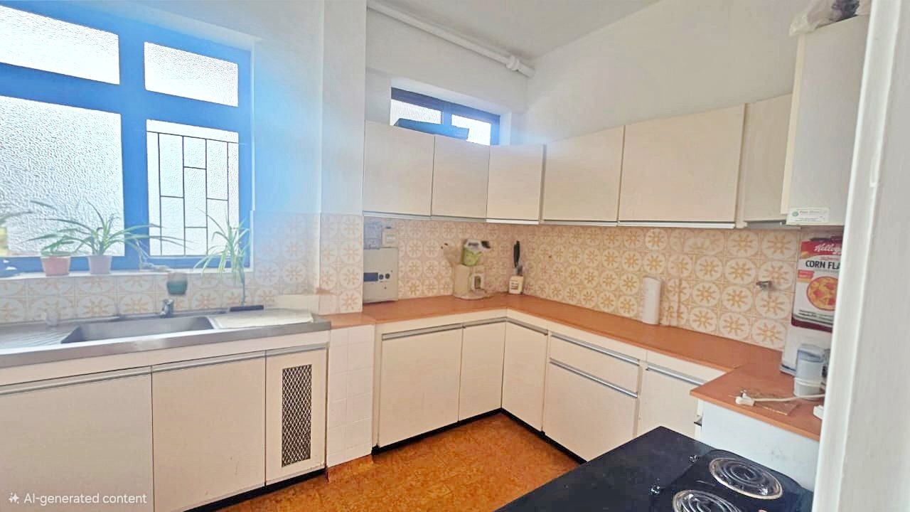 The kitchen, while having a touch of vintage charm with its white cabinetry and patterned backsplash, is fully functional and offers ample storage. It includes a sink and a large window brightens up the space, making meal prep a pleasant experience. It’s a great spot to get creative with your cooking.