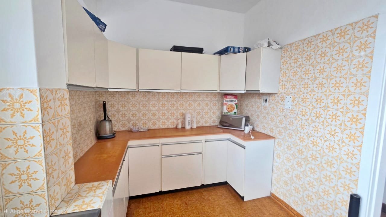 The kitchen, while having a touch of vintage charm with its white cabinetry and patterned backsplash, is fully functional and offers ample storage. It includes a sink and a large window brightens up the space, making meal prep a pleasant experience. It’s a great spot to get creative with your cooking.