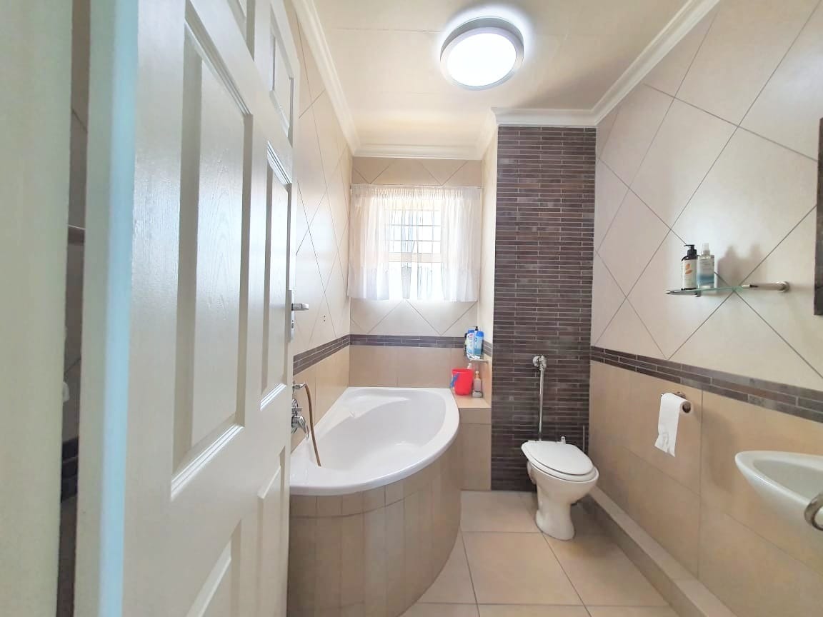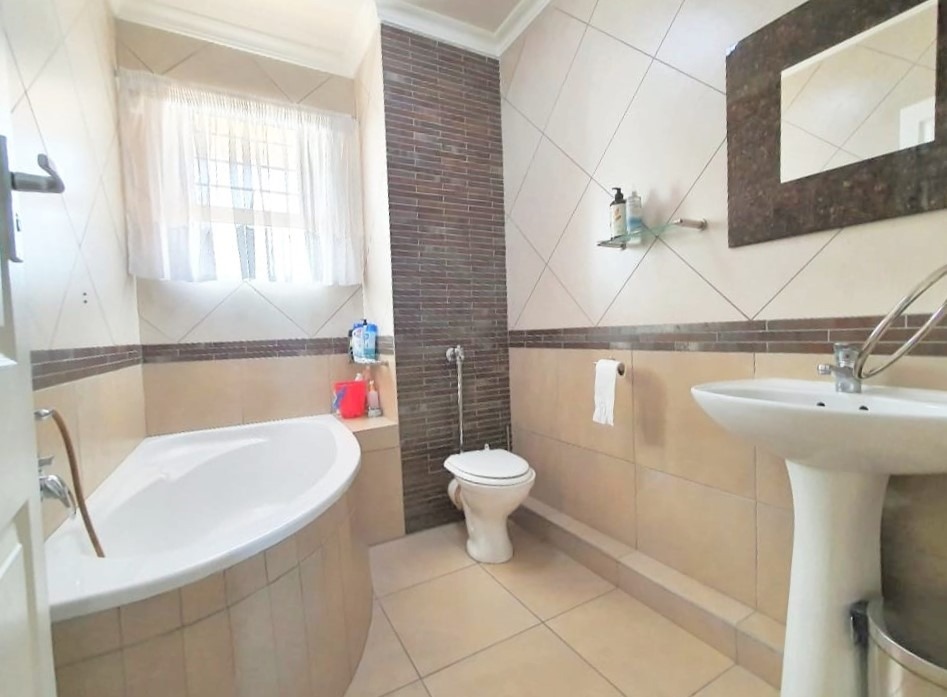 Upmarket home, with fine tiling and modern finishing. Gourmet kitchen with Caesarstone tops. The bathrooms have been modernized, with a large shower cubicle, modern bathtub. This is a well-loved home