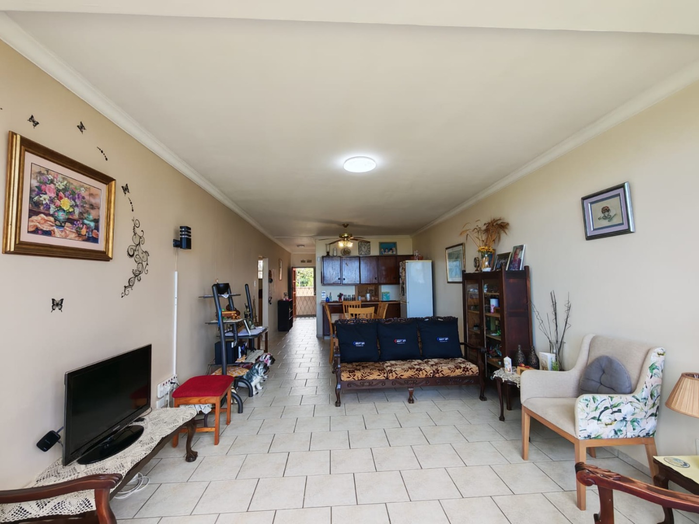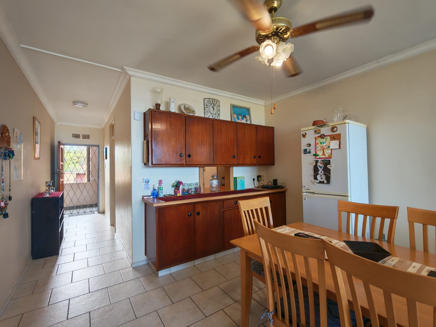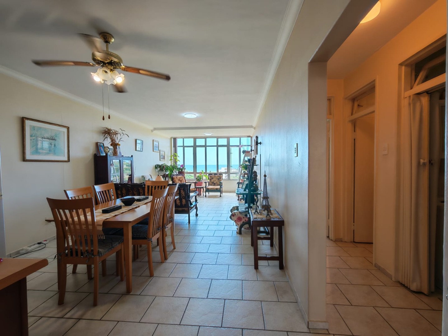 Discover this charming 2-bedroom, 2-bathroom residence nestled in the suburban heart of Amanzimtoti, offering a unique opportunity to embrace coastal living. This property, with its generous 126.00 sqm floor size on a substantial 3721.00 sqm erf, presents a canvas for modern updates while providing immediate comfort and scenic views. The interior boasts an inviting open-plan living and dining area, bathed in natural light from large windows that frame panoramic ocean views. The functional galley-style kitchen, equipped with ample white cabinetry, wood-look countertops, and a double sink, provides extensive storage and includes a built-in microwave, ready to cater to your culinary needs. Tiled flooring throughout ensures easy maintenance and a cohesive flow. Comfort is key in the two spacious bedrooms, each featuring built-in wardrobe storage for convenience. Climate control is assured with both air conditioning and ceiling fans in the main bedroom. The two bathrooms offer versatility, each including both a shower and a bathtub, alongside neutral tiling and natural light from small windows. Step into the enclosed balcony or sunroom, a bright space perfect for relaxation or cultivating plants, where expansive ocean and green landscape views can be savoured year-round. The property includes a single garage and benefits from security features such as a fence, electric fencing, and an access gate, providing peace of mind. While the home offers a solid foundation, its dated aesthetic presents an exciting opportunity for renovation to create your dream coastal retreat. Key Features: * 2 Bedrooms, 2 Bathrooms * 1 Garage * 126.00 sqm Floor Size * Open-plan living and dining area * Panoramic ocean and scenic views * Enclosed balcony/sunroom * Built-in wardrobe storage * Air conditioning and ceiling fan in main bedroom * Fenced with electric fencing and access gate