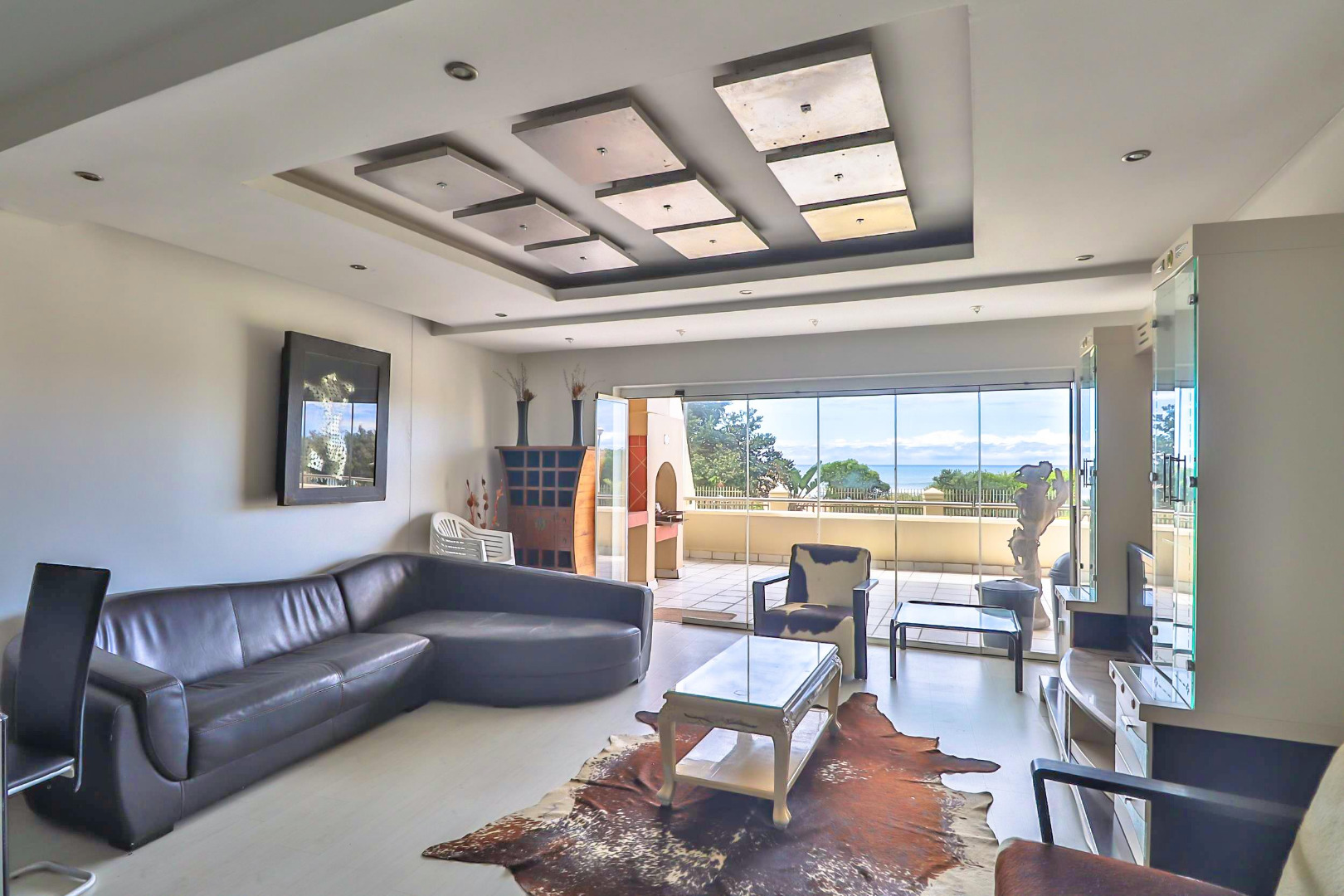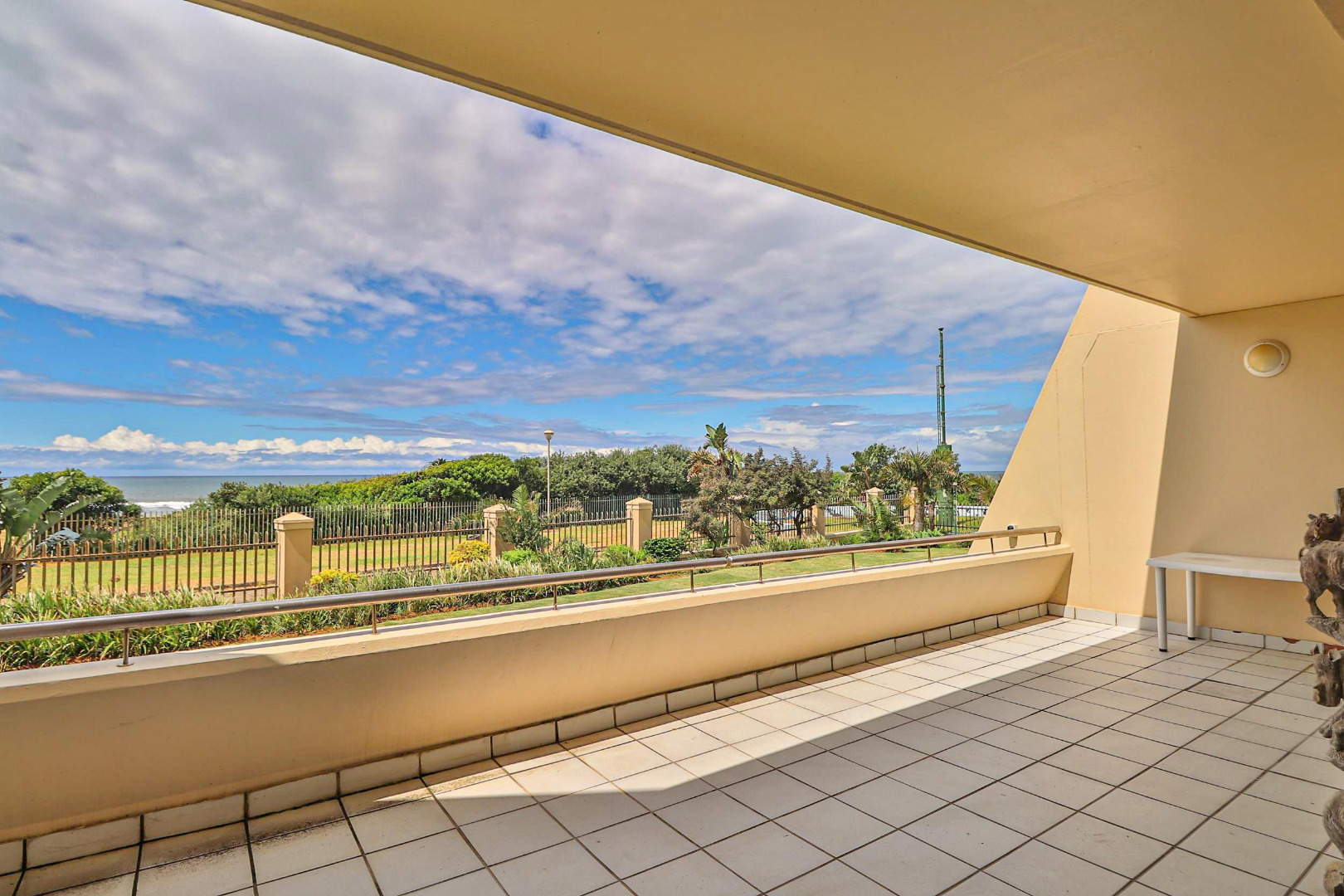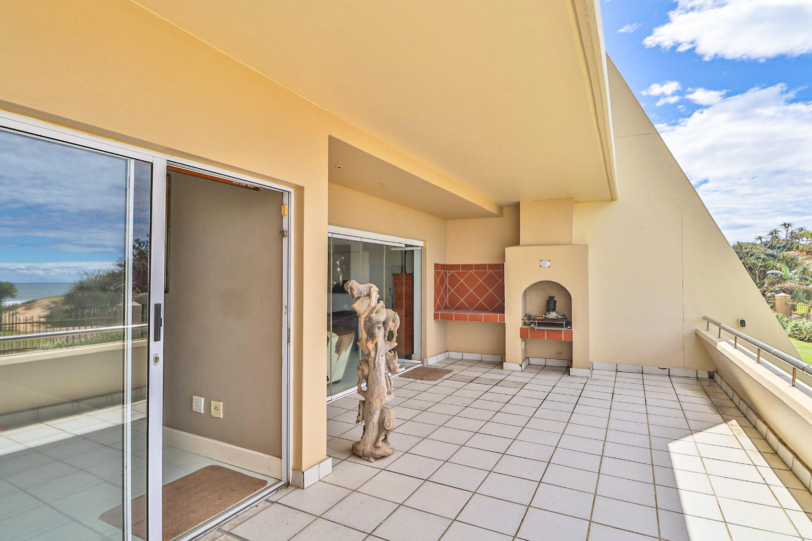 The main bedroom with en-suite opens onto the balcony so you can enjoy the sea views while relaxing in bed. All 3 bedrooms have built-in cupboards and the apartment is tiled throughout. The open plan kitchen, dining room, and lounge lead onto the large balcony which has a built-in braai.