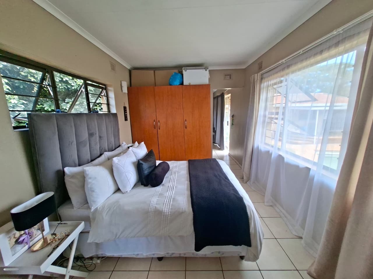 The home offers three comfortable bedrooms, each benefiting from generous natural light and tiled flooring. The main bedroom includes a convenient en-suite bathroom, while a second well-appointed bathroom serves the remaining rooms. Built-in wooden wardrobes provide practical storage solutions, enhancing the functional appeal of the sleeping quarters.