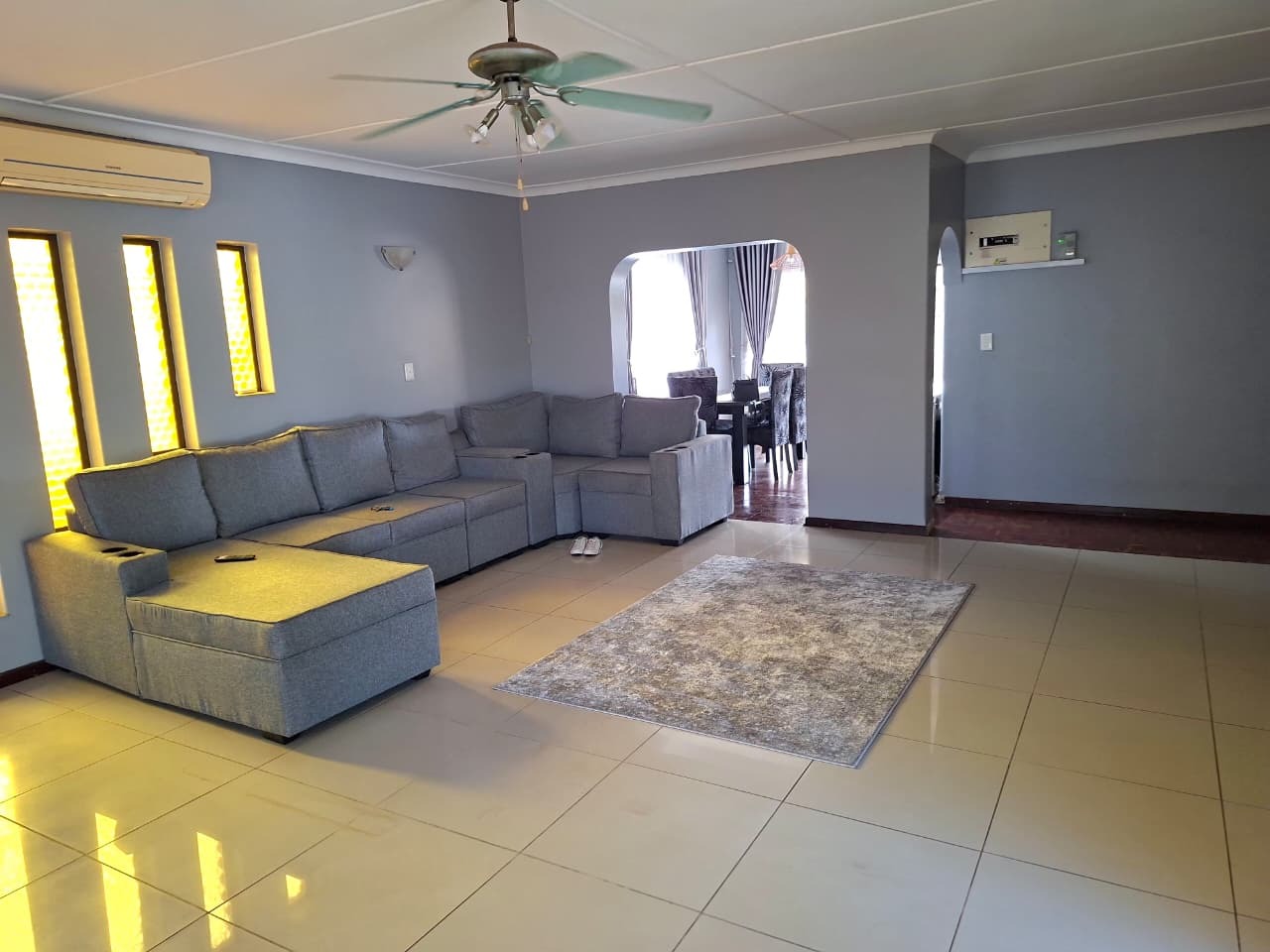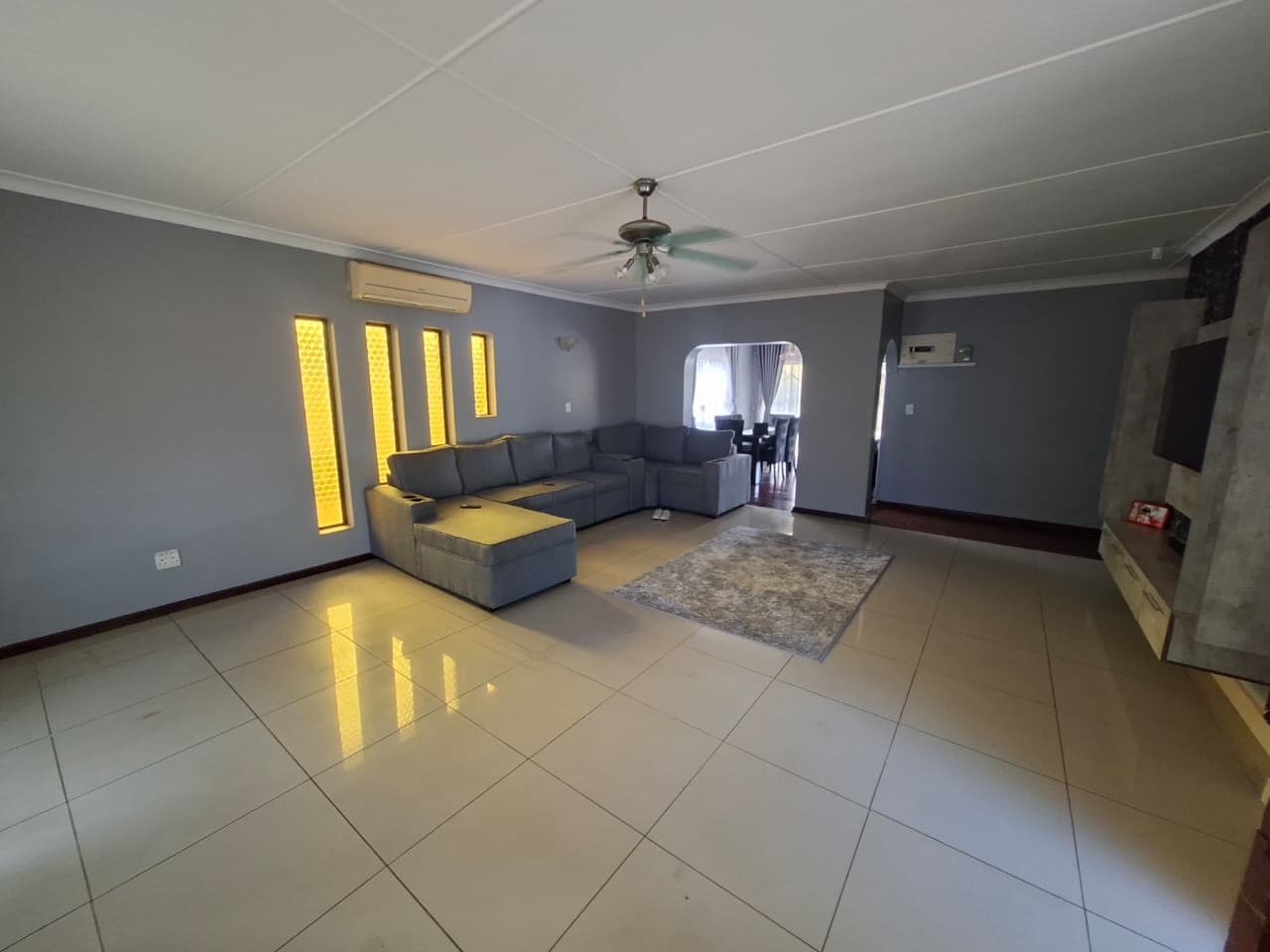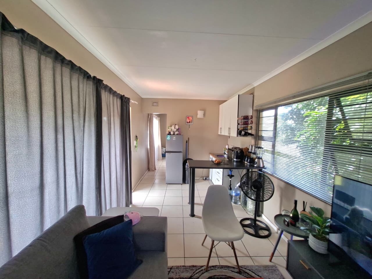 Step inside this Athlone Park residence to discover an inviting open-plan living area, seamlessly connecting the lounge, dining space, and kitchen. Tiled flooring throughout ensures easy maintenance, while large windows flood the interiors with natural light. The compact kitchen features modern white cabinetry and ample counter space, ideal for everyday meal preparation.