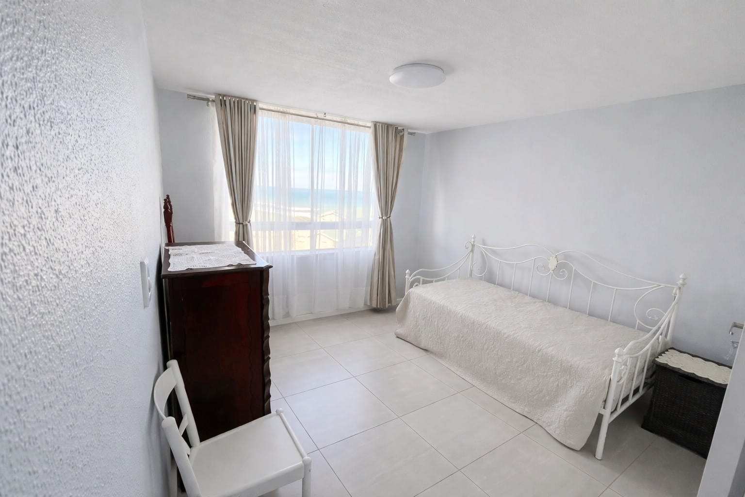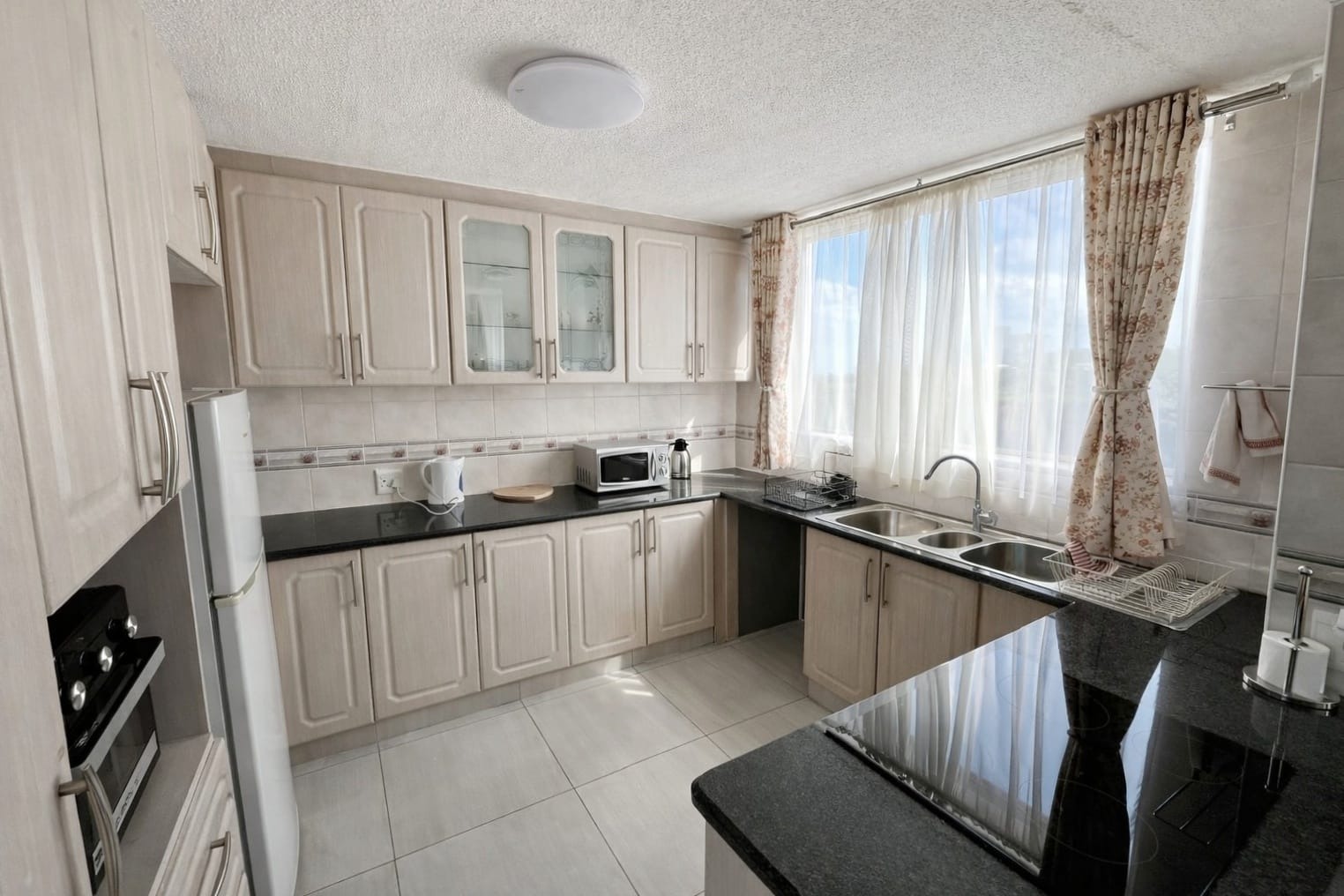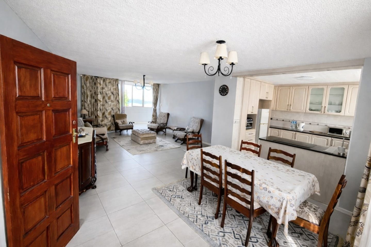 The lounge area opens through aluminium stack doors onto an enclosed balcony, where breathtaking sea views create the perfect setting to relax and unwind. All three bedrooms are generously sized and fitted with built-in cupboards. The main bedroom boasts an en-suite bathroom with a bath, while the second family bathroom is fitted with a shower and plumbing for a washing machine.