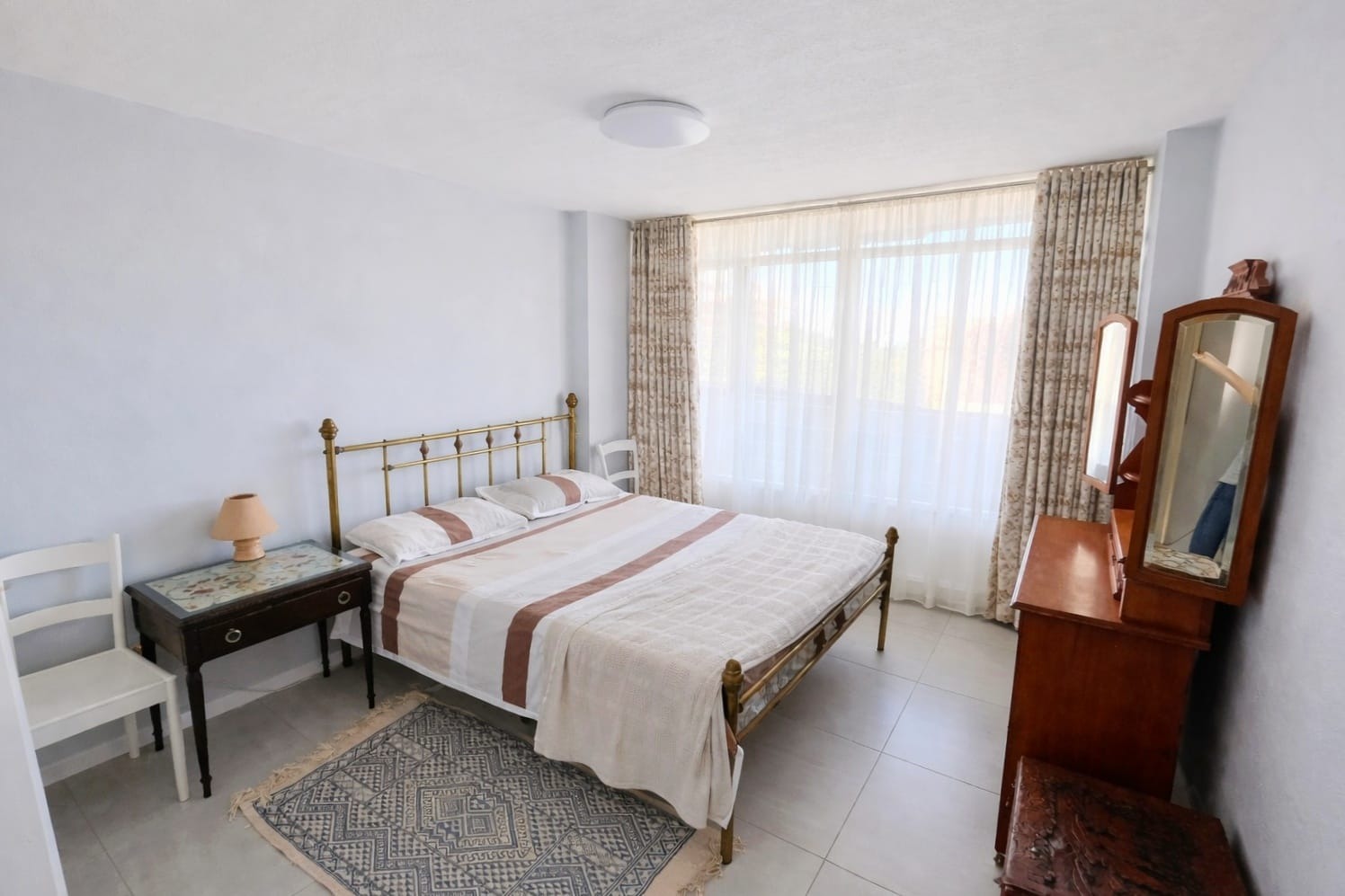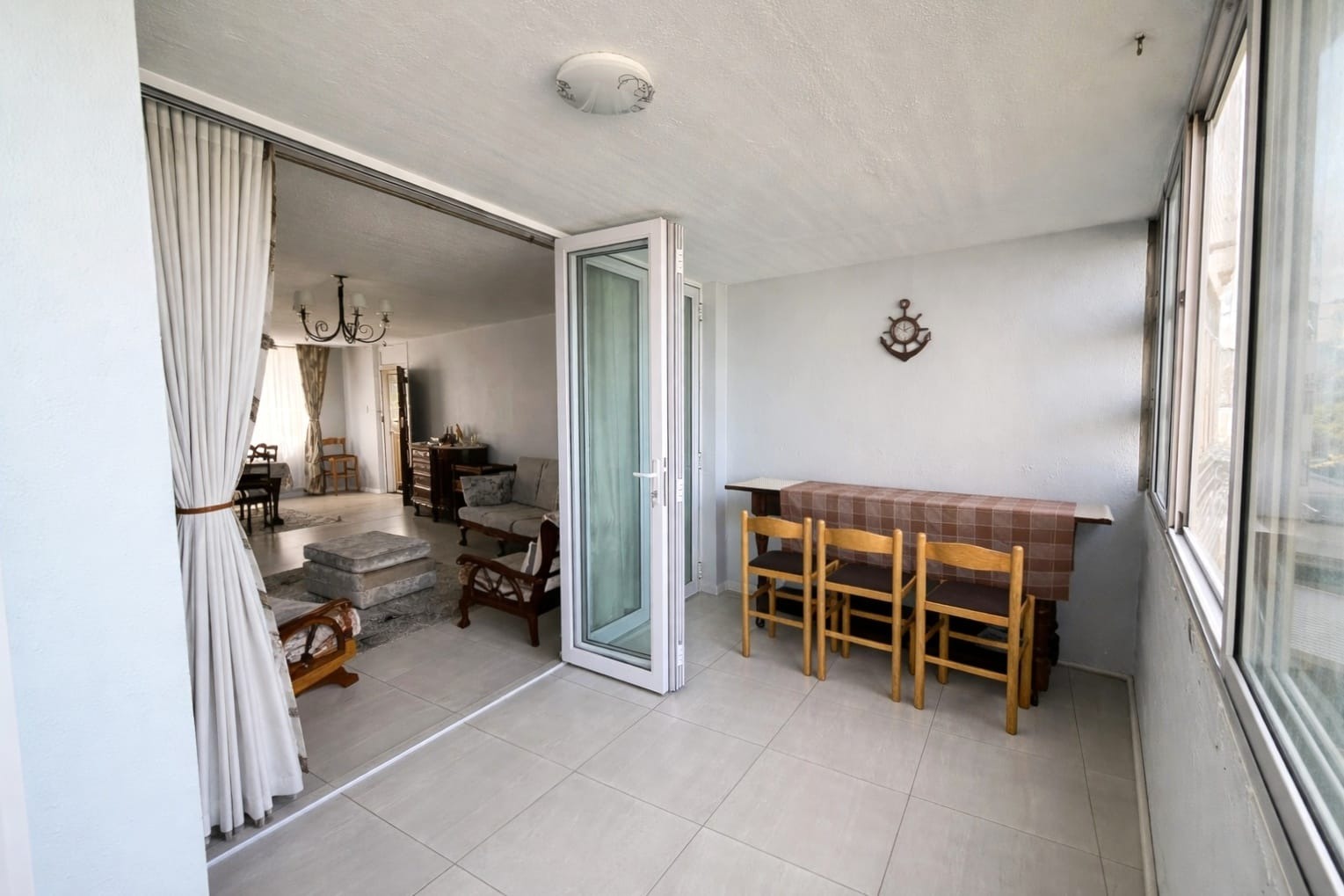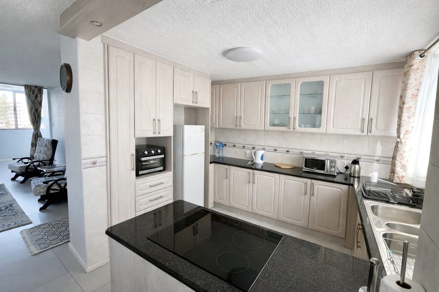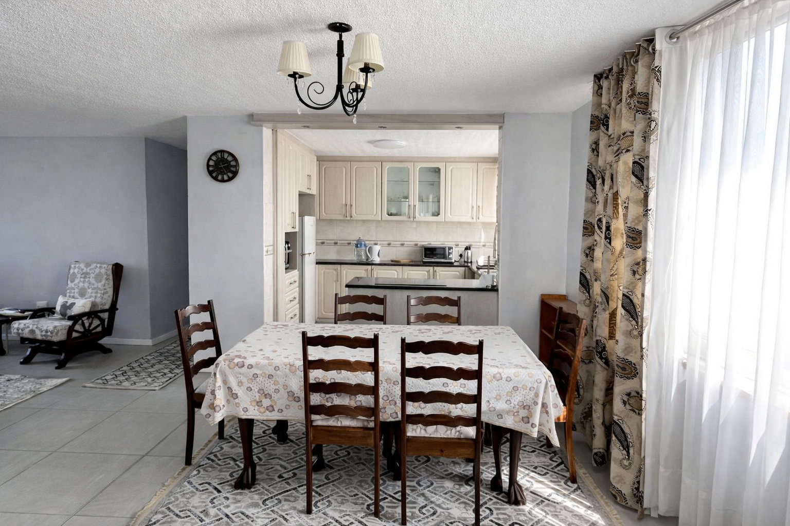 The lounge area opens through aluminium stack doors onto an enclosed balcony, where breathtaking sea views create the perfect setting to relax and unwind. All three bedrooms are generously sized and fitted with built-in cupboards. The main bedroom boasts an en-suite bathroom with a bath, while the second family bathroom is fitted with a shower and plumbing for a washing machine.