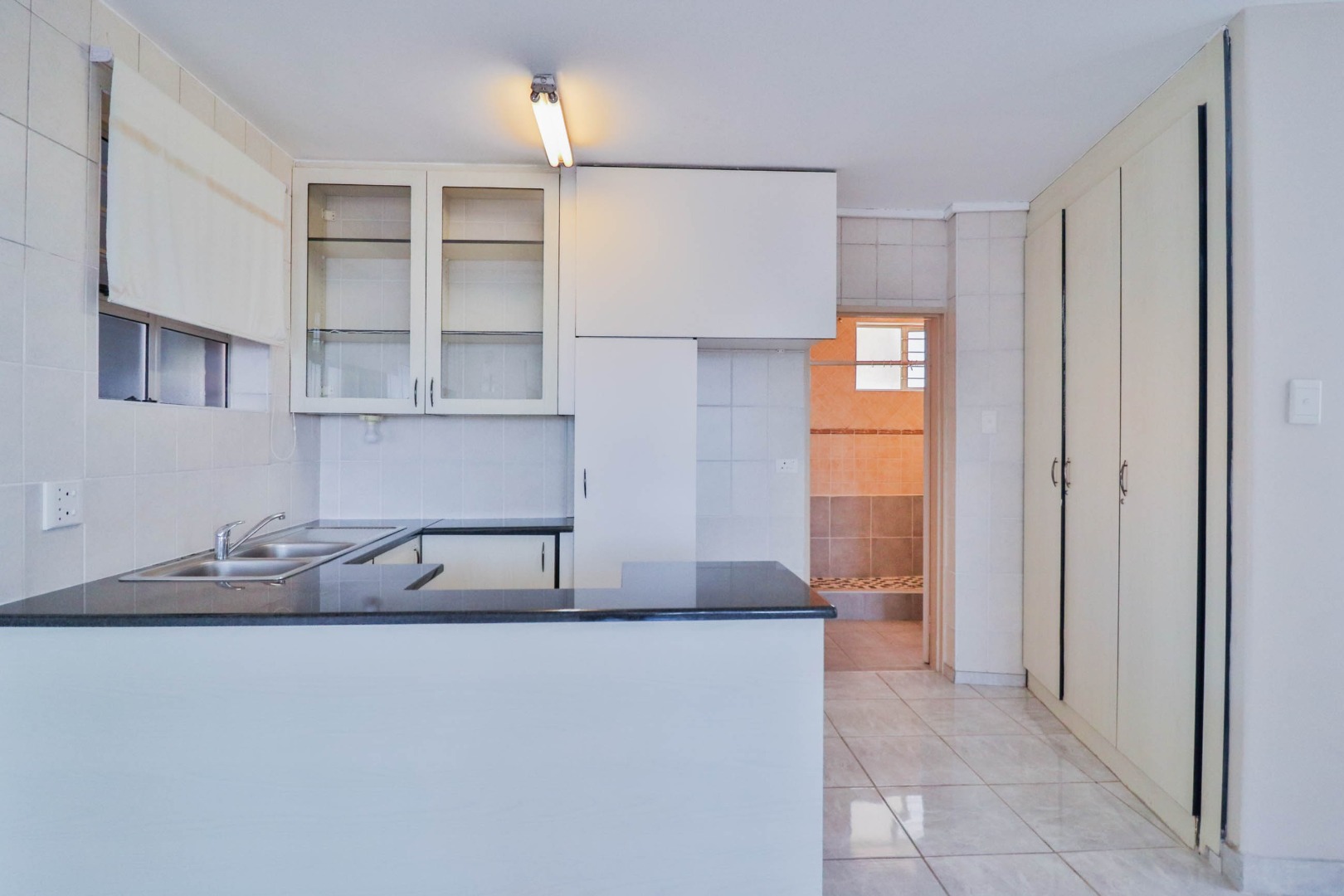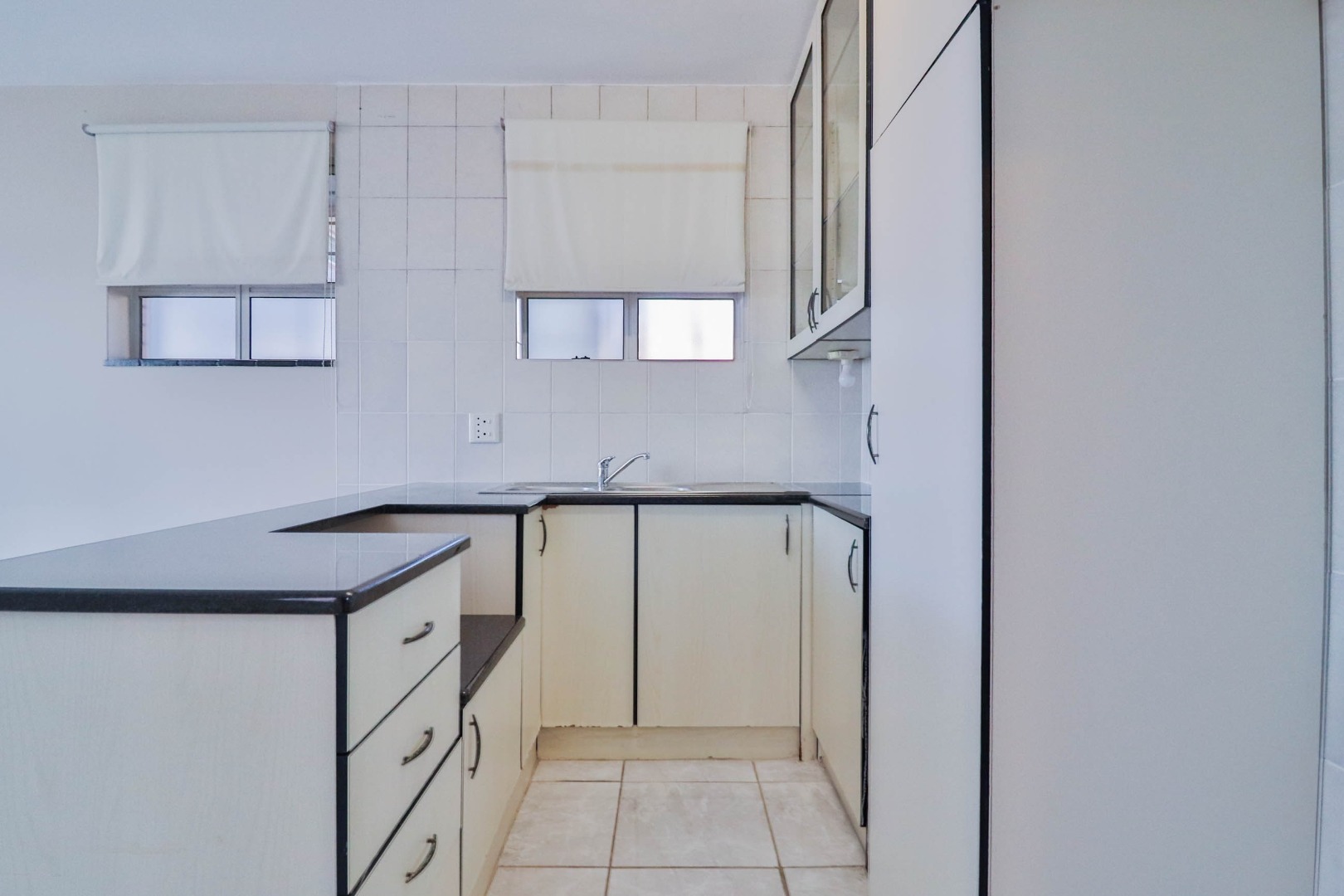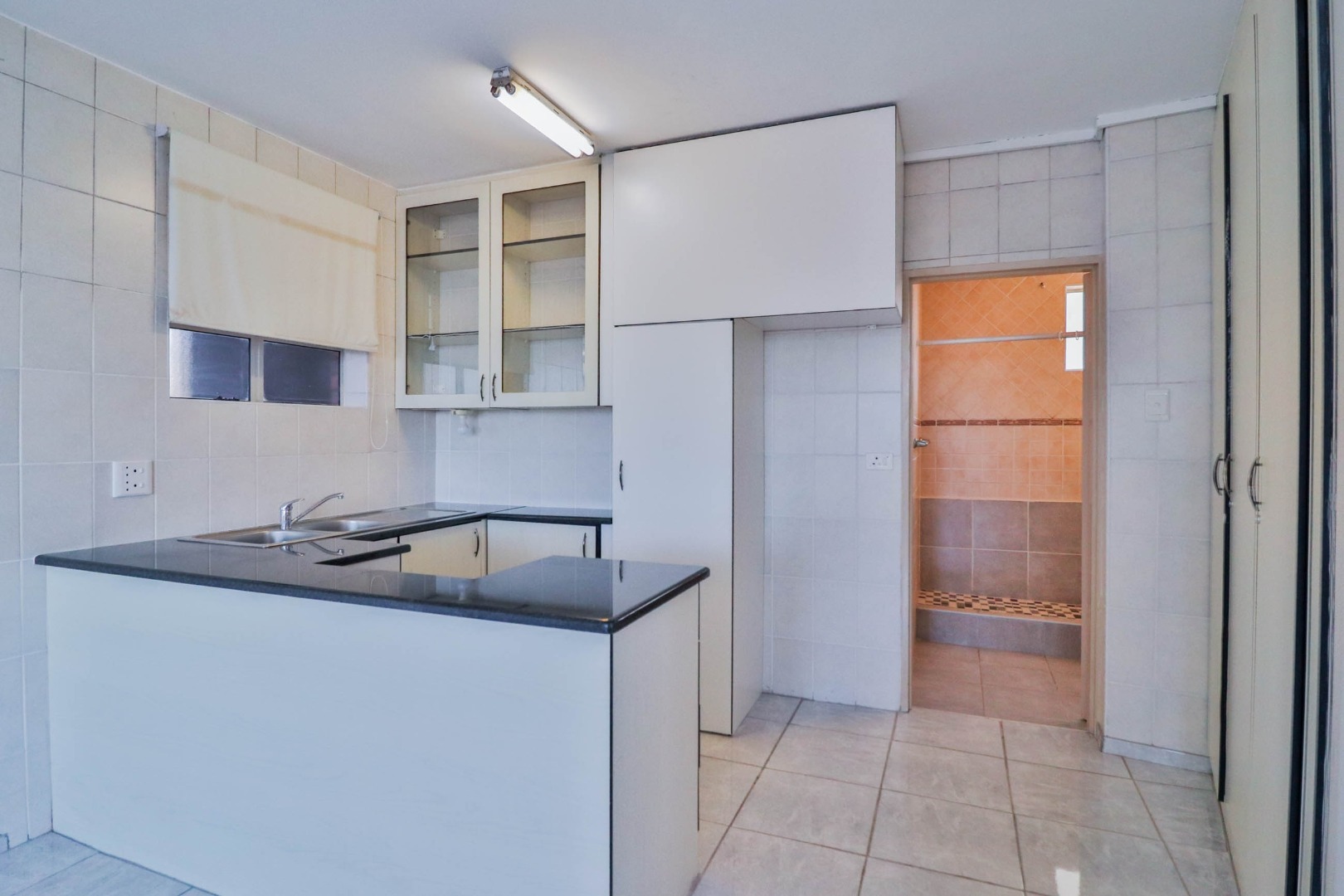 Modern kitchen with granite tops and double basin with lots of cupboard space.