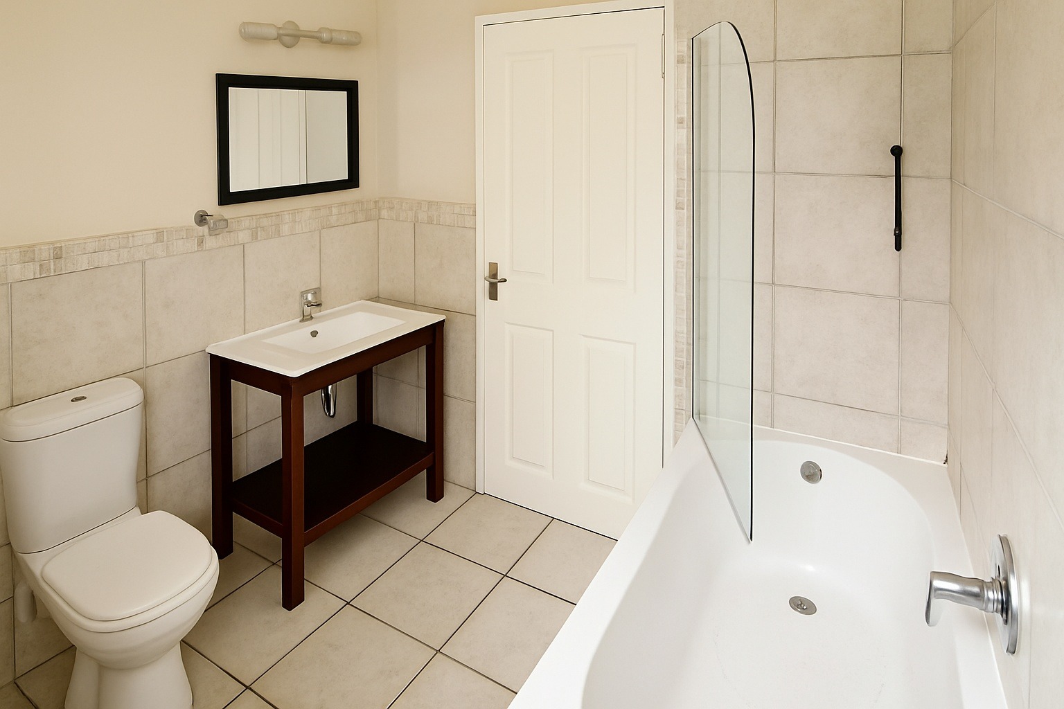 Both bedrooms are generously sized, featuring large windows, built-in cupboards and ceiling fans, ensuring comfort and plenty of natural light. The apartment boasts two modern bathrooms — one with a shower, and the second with a bath and shower over the bath, offering convenience for both family living and guests.