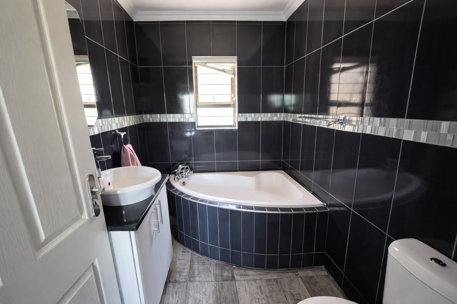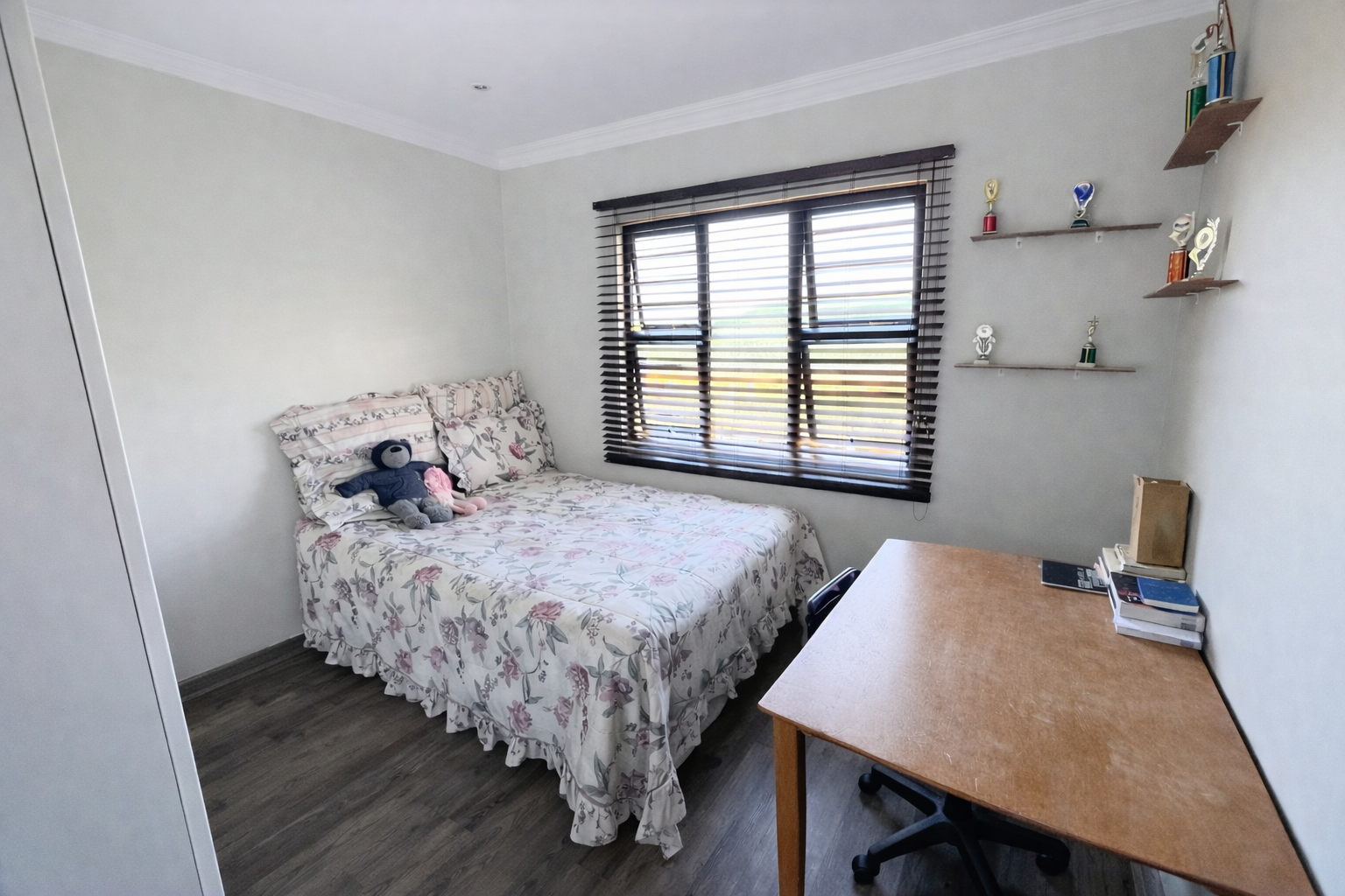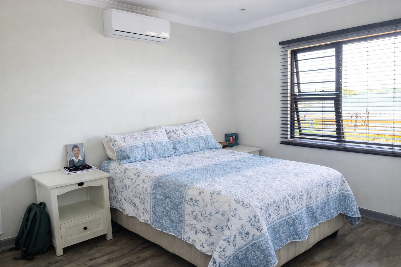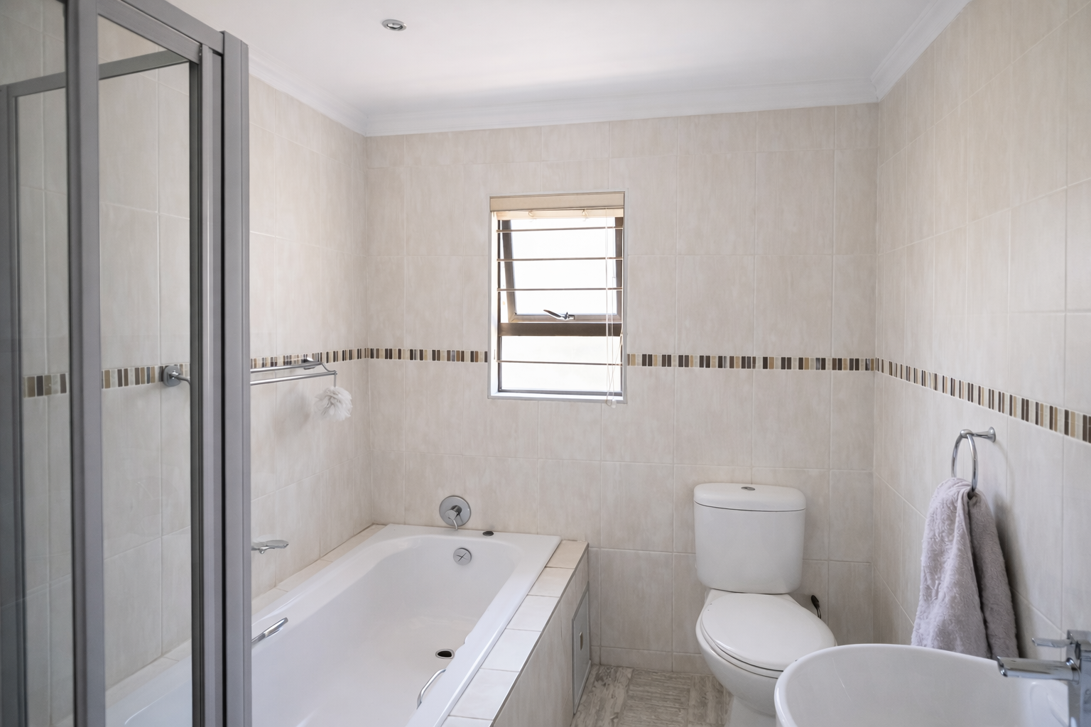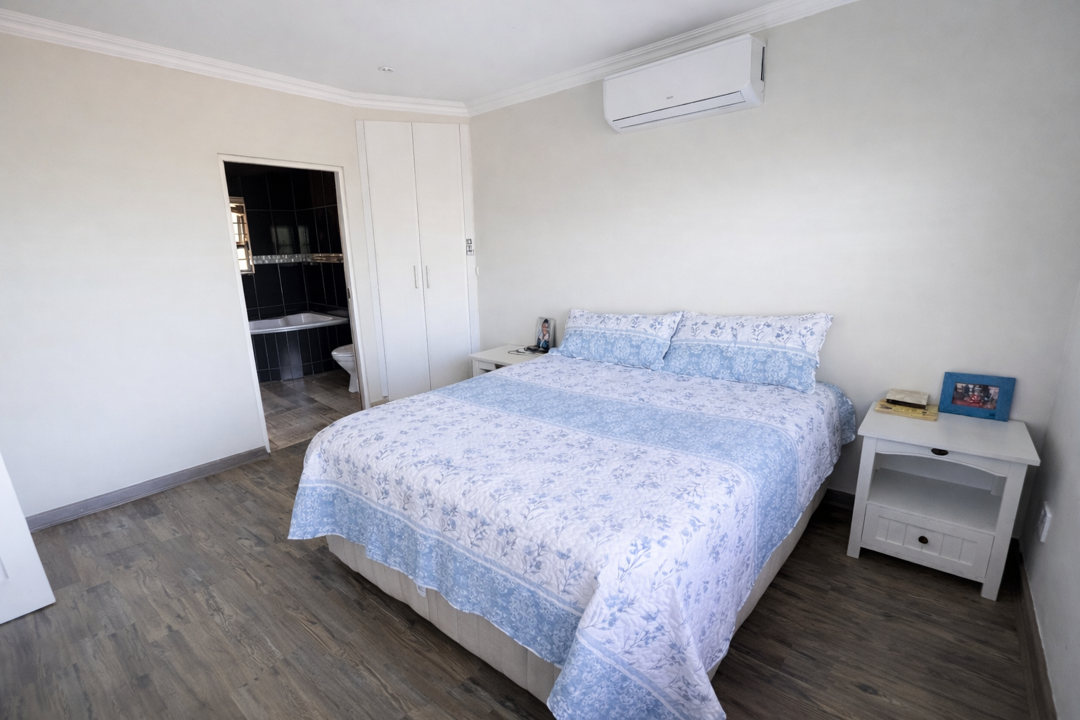 There are three well-sized bedrooms, all fitted with built-in cupboards. The master bedroom includes air-conditioning and an en-suite bathroom with a corner bath. The remaining two bedrooms are serviced by a full family bathroom with both a bath and shower.