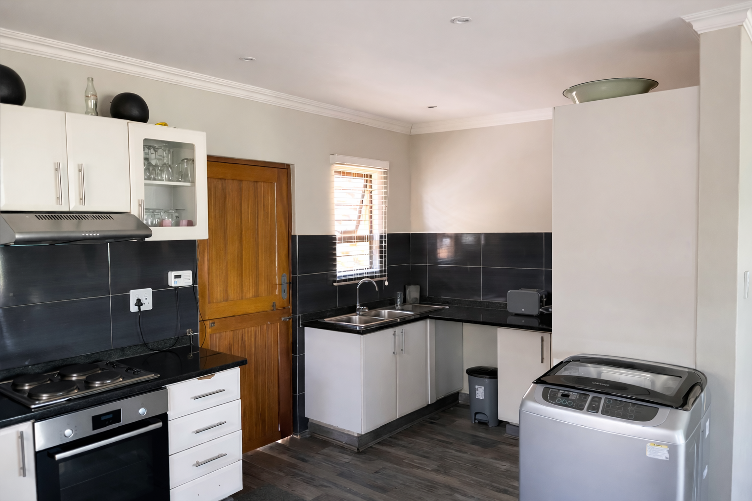 The modern kitchen is well appointed with granite countertops, a hob, under-counter oven and extractor fan, and plumbing for both a dishwasher and washing machine, ensuring everyday convenience.