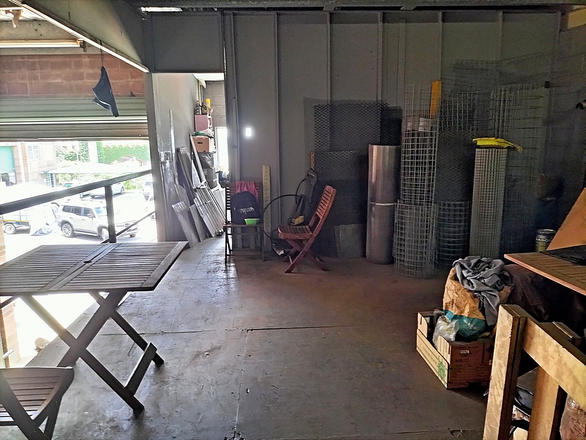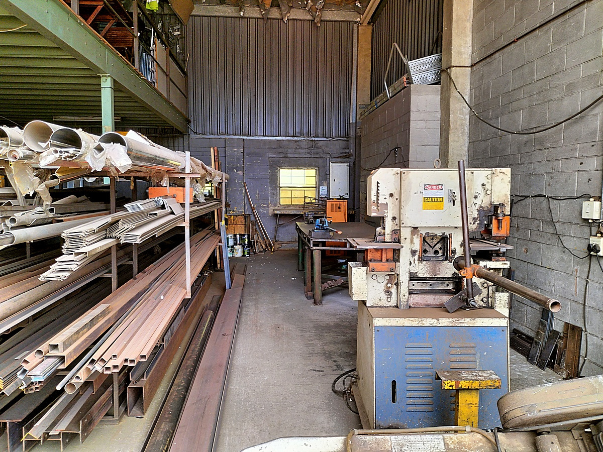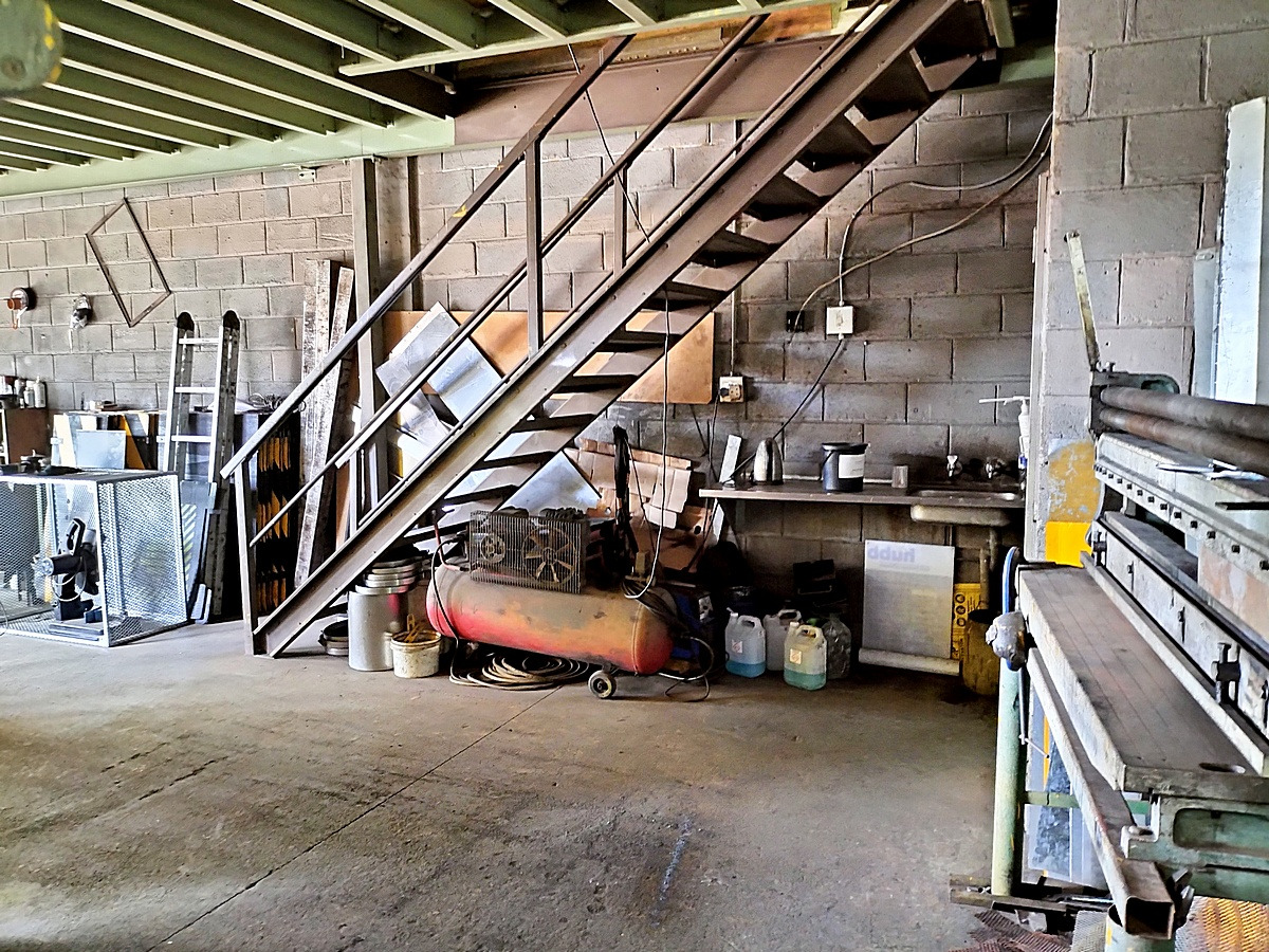 The interior boasts high ceilings and durable concrete block walls with a robust concrete floor, ideal for industrial use. Natural light streams in through multiple windows, enhancing the workspace. A practical mezzanine level offers additional storage or can be adapted for office space, while a sturdy metal staircase provides easy access between levels. The layout for industrial machinery, presenting a ready-to-customise environment for your business needs.