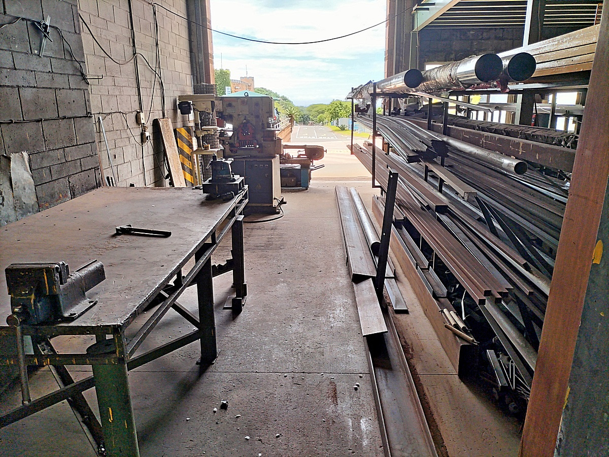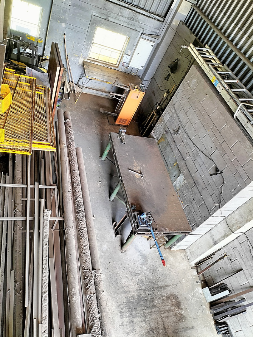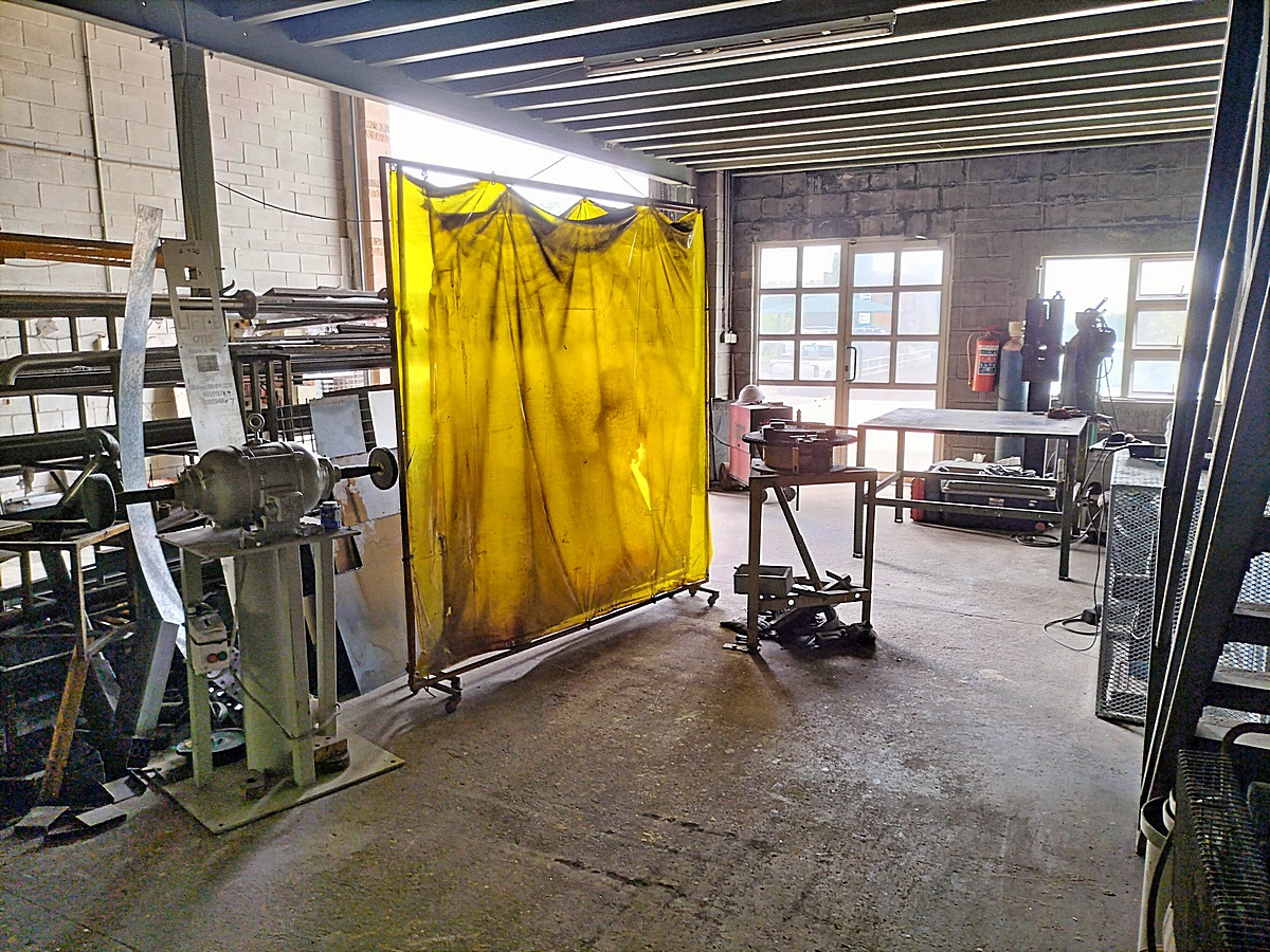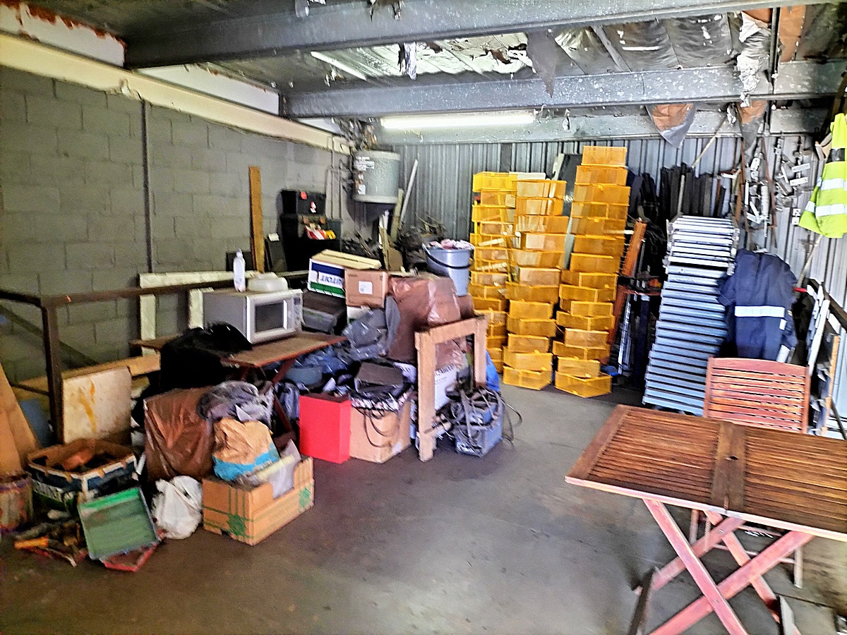 The interior boasts high ceilings and durable concrete block walls with a robust concrete floor, ideal for industrial use. Natural light streams in through multiple windows, enhancing the workspace. A practical mezzanine level offers additional storage or can be adapted for office space, while a sturdy metal staircase provides easy access between levels. The layout for industrial machinery, presenting a ready-to-customise environment for your business needs.