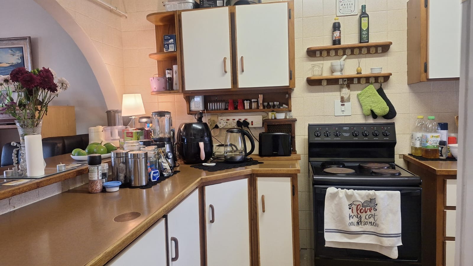 This spacious neat family unit has neat kitchen, double basin, stove7 formica counter tops.